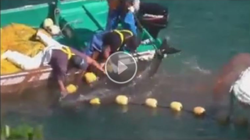 Als alle 22 Delfine brutal abgeschlachtet wurden fuhr ein Mörder weg von der Bucht auf das offene Wasser und warf das verpackte tote Delfin Baby über Bord; in der Hoffnung, dass niemand diese Gräueltat beobachten würde.