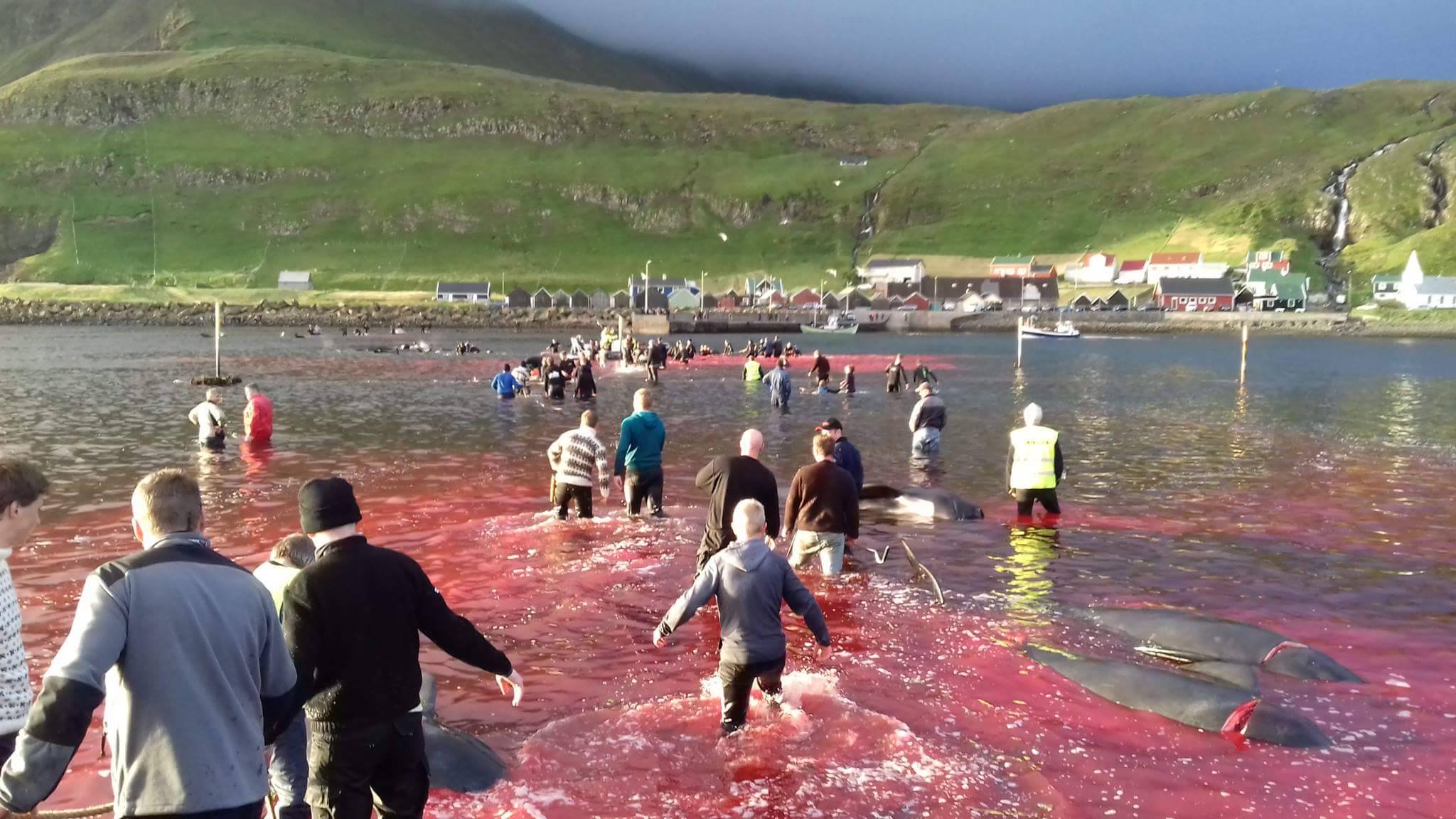Das Blut von 100 wehrlosen sanften Wesen färbte das Meer am Strand der Färöer Inseln tiefrot durch den unersättlichen Blutdurst der barbarischen Monster. Viele Färöer sind wahrlich besessen mit ihren kleinen schnellen Motorboten Wale und Delfine auf dem offenen Meer zu hetzen und zu foltern, am Strand verwandeln sie sich in blutrünstige Monster, denn töten ist ihre Tradition. „Ein Mann der noch kein Wal oder Delfin getötet hat, ist kein Mann“ , soder Slogan und Rechtfertigung ihrer früh-mittelaterlichen Tradition.