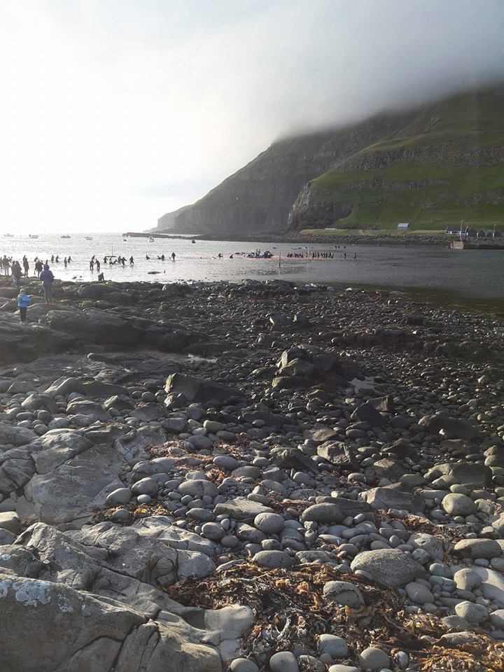 Dienstagabend gegen 18:00 wurden mit Schnellbooten 80-100 Pilotwale an den Strand von Fámjin getrieben und zum Stranden gezwungen. Sofort stürzte sich eine Meute von ca. 50 Personen mit Messern und Hacken an Seilen befestigt bewaffnet, Kinder, Erwachsene und Frauen auf die Pilotwale um ihnen mit pfeilartigen Dolchen das Rückenmark zu durchtrennen und anschliessend mit Messern den Nacken aufzuschlitzen.