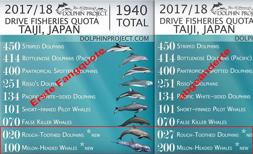 Am 5. Dezember 2017 wurde das Limit getöteter Breitschnabeldelfine (Melon-Headed whales) um sieben überschritten. Jede normale Regierung würde sofort Verwarnungen oder Bussen aussprechen wenn beispielsweise Jäger mehr Wild schossen als erlaubt; aber nicht in Japan wenn es um Delfinmord geht, stattdessen erhöhte die Regierung letzte Woche einfach nur die Fangquote von hundert auf 200 Breitschnabeldelfine. Auch die Zahl der Rauhzahn Delfine (Rough-Toothed Dolphins) wurde ebenfalls um 7 erhöht, weil 7 mehr dieser Delfine an Delfinarien verkauft wurden.