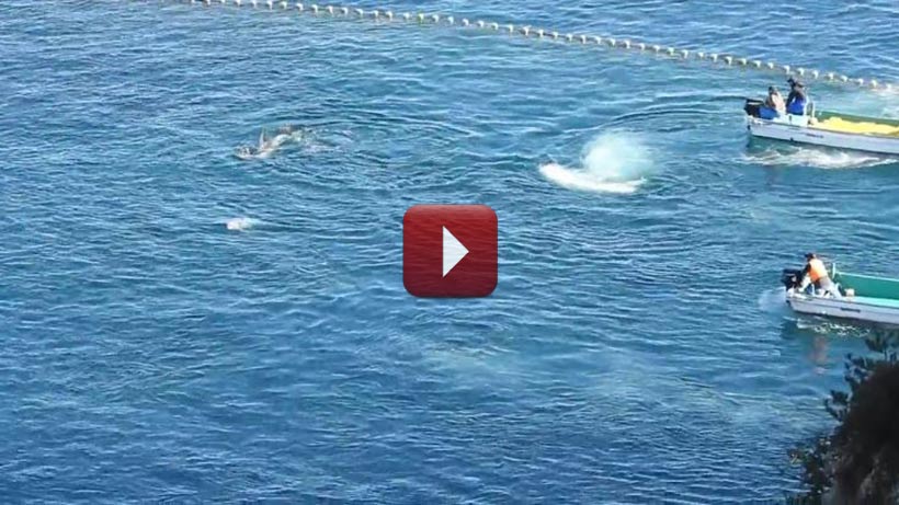 Fünf erschöpfte Delfine schwammen letztlich eng aneinander und gaben verwirrt und verängstigt auf als die äusserst aggressiven Psycho-Monster nun das Innennetzt mit ihnen darin näher an den Strand zogen.