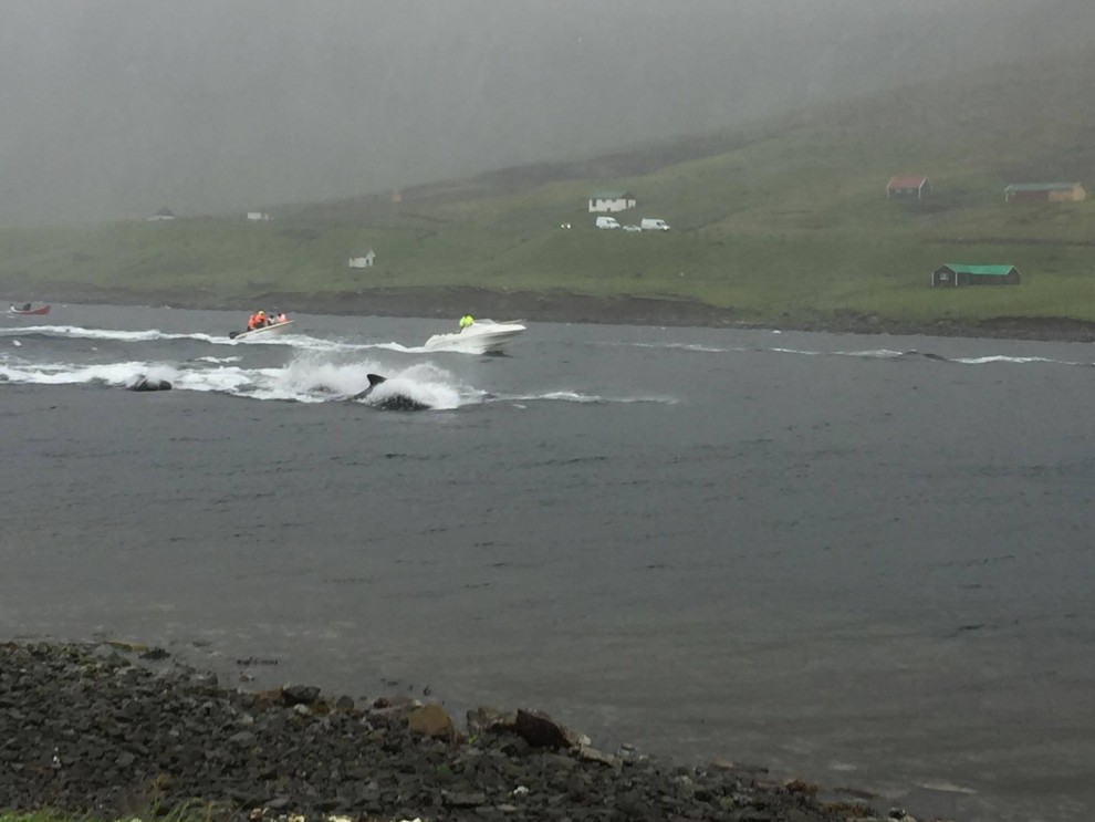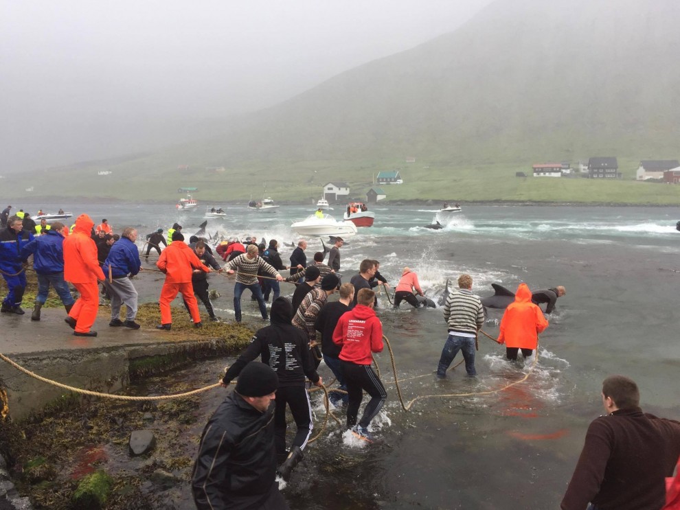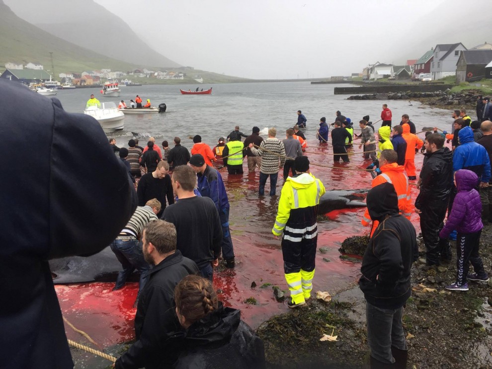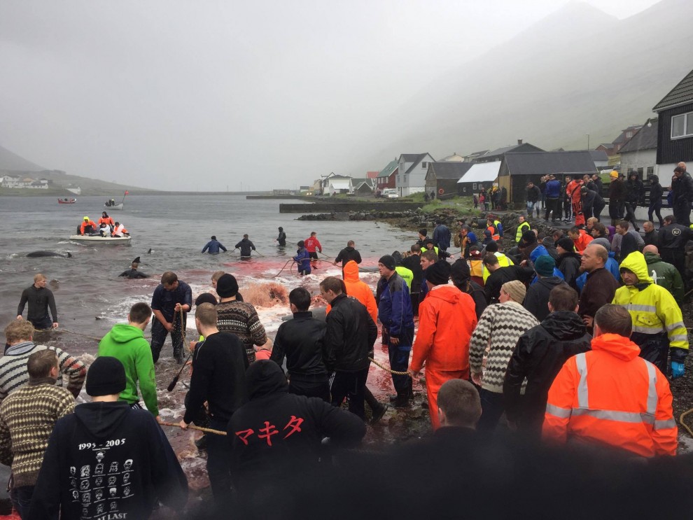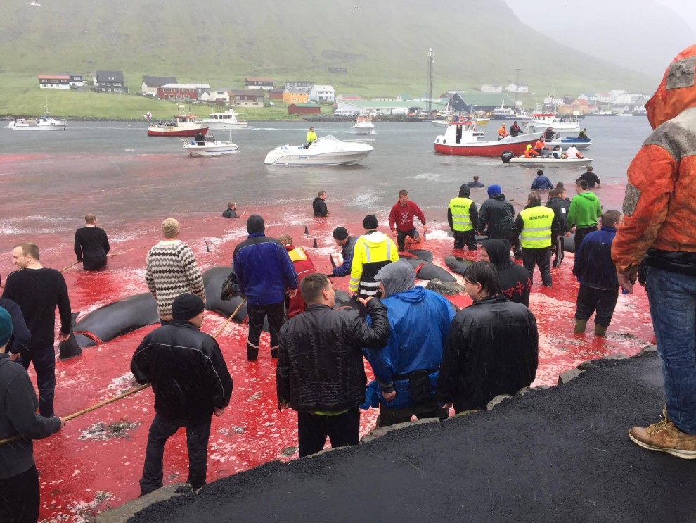 Trotz schlechten Wetter fuhren 20 Schnellboote aus dem Hafen, darunter auch kleinere einsitzige "Speedmaschienen", wie die "Gestörten" rasten sie mit Vollgas zu der Pilotwal Familie hinaus um sie an den Strand von Hvannasund zu jagen wo sie brutal abgeschlachtet wurden. Zweienhalb Stunden später strandeten mehr als 70 Pilotwale, sofort stürzte sich die nervös wartende Meute von über 50 Färöer mit langen Messern und Hacken an Seilen bewaffnet über die verängstigte, verwirrte Pilotwal Familie. Alle Familienmitglieder wurden von den blutrünstigen Barbaren im Blutrausch niedergemetzelt, Babys, Kinder, Erwachsene und die Matriarchin.