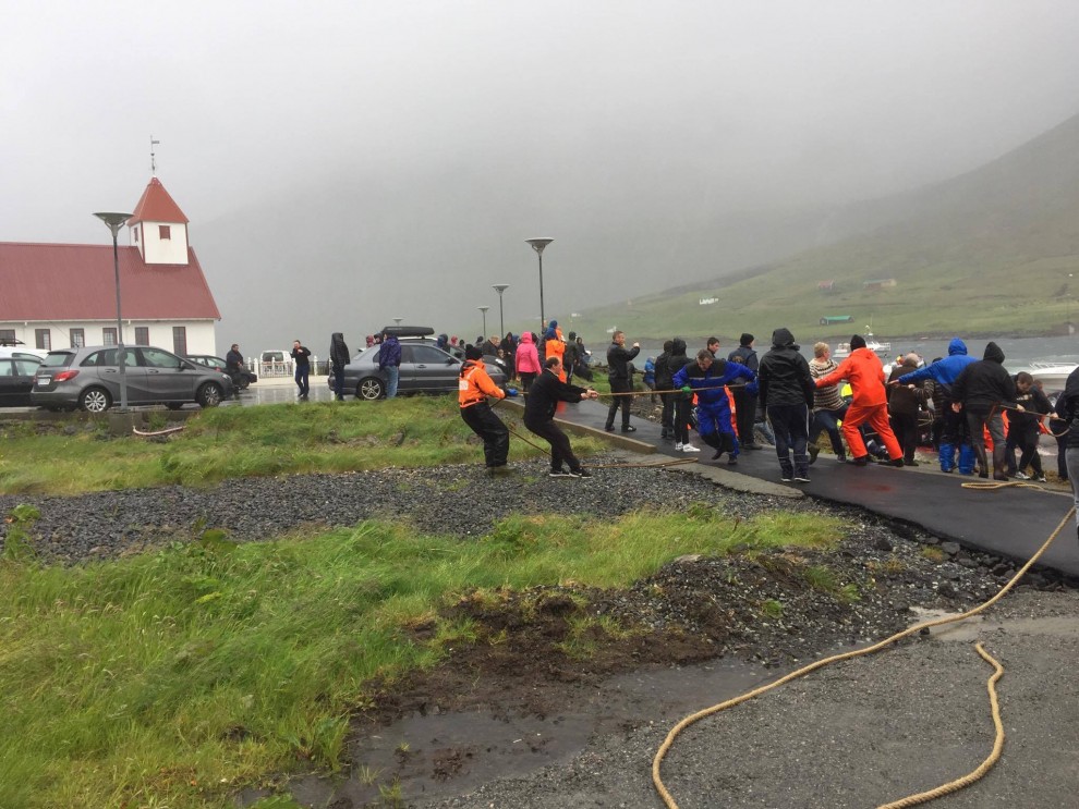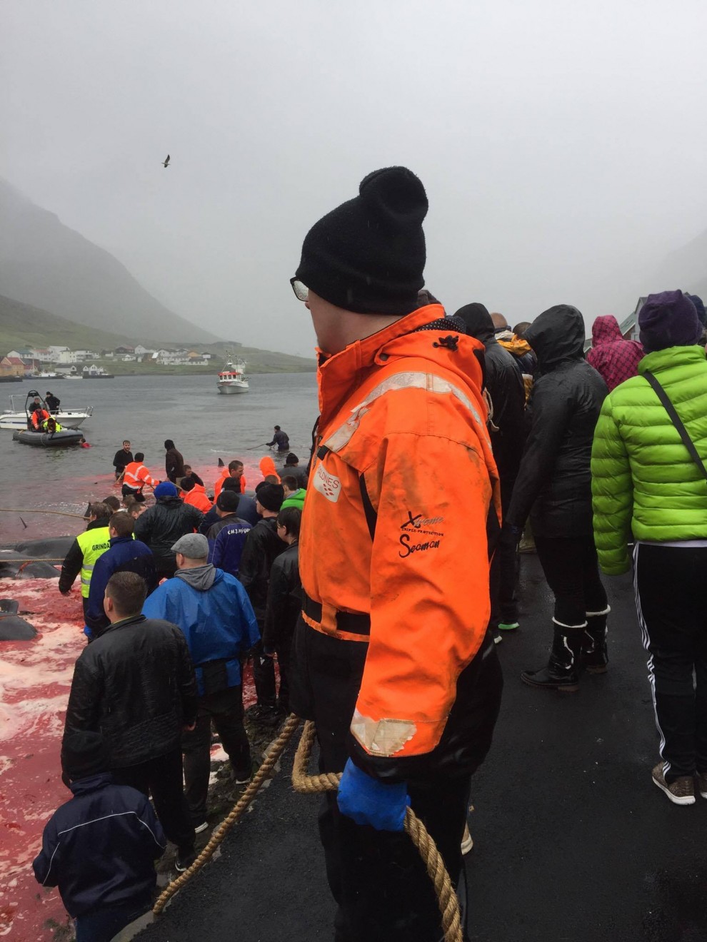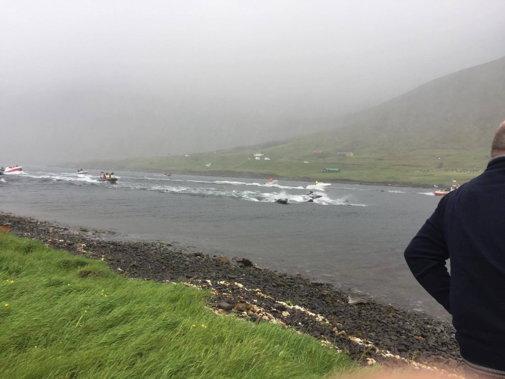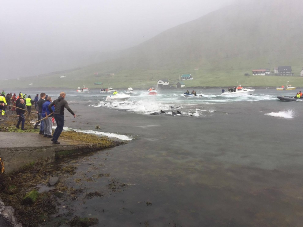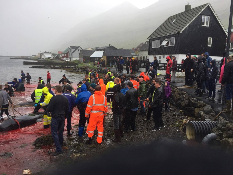 Trotz schlechten Wetter fuhren 20 Schnellboote aus dem Hafen, darunter auch kleinere einsitzige "Speedmaschienen", wie die "Gestörten" rasten sie mit Vollgas zu der Pilotwal Familie hinaus um sie an den Strand von Hvannasund zu jagen wo sie brutal abgeschlachtet wurden. Zweienhalb Stunden später strandeten mehr als 70 Pilotwale, sofort stürzte sich die nervös wartende Meute von über 50 Färöer mit langen Messern und Hacken an Seilen bewaffnet über die verängstigte, verwirrte Pilotwal Familie. Alle Familienmitglieder wurden von den blutrünstigen Barbaren im Blutrausch niedergemetzelt, Babys, Kinder, Erwachsene und die Matriarchin.
