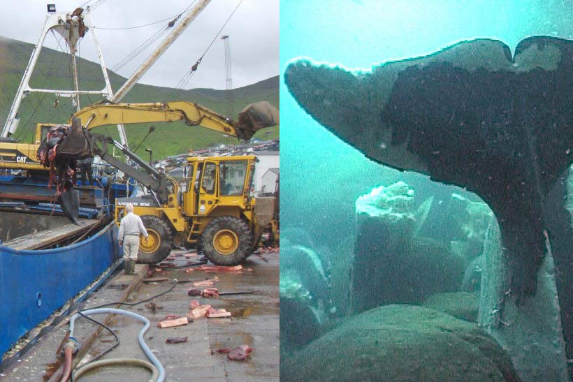 Die Färinger Barbaren stillen mit dem Abschlachten der Pilotwale und Delfine ihre Blut-Lust zum Töten. Das Fleisch der Opfer wird kaum noch gegessen, die besten Stücke werden wahrscheinlich in der Lachszucht verwendet. Der grosse Rest der toten Pilotwale wird auf Boote geladen und im Meer versenkt.