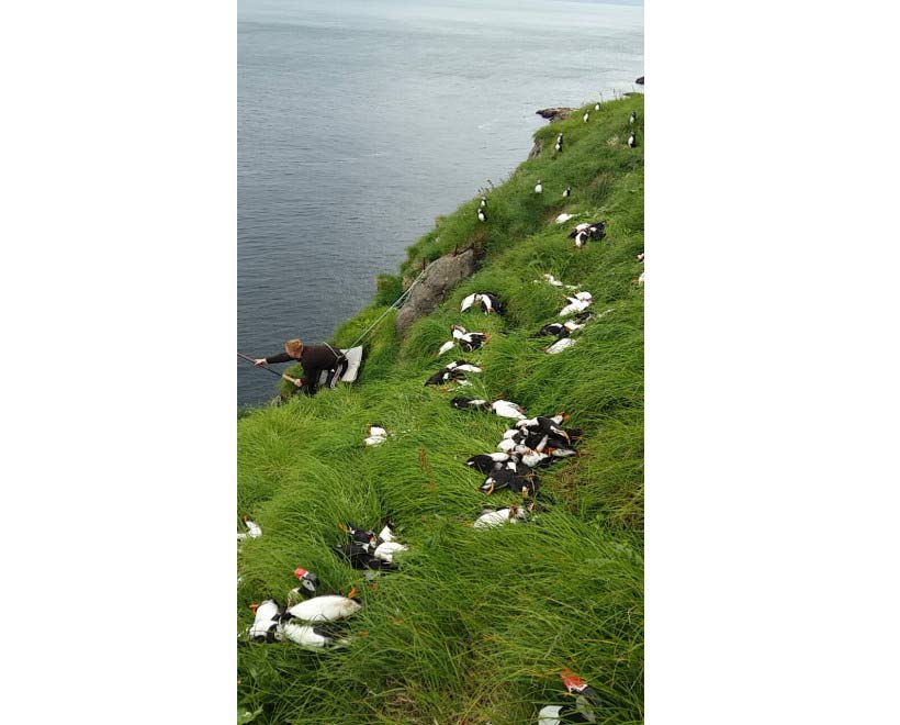 300 Puffins (Papageientaucher) und andere vom Aussterben bedrohte Meeresvögel tötet ein einzelner Färöer an einem Tag. Trotzdem dass diese Atlantische Vögel stark vom Aussterben bedroht sind, werden sie den Touristen in den Restaurants serviert; und die Nachfrage ist gross.