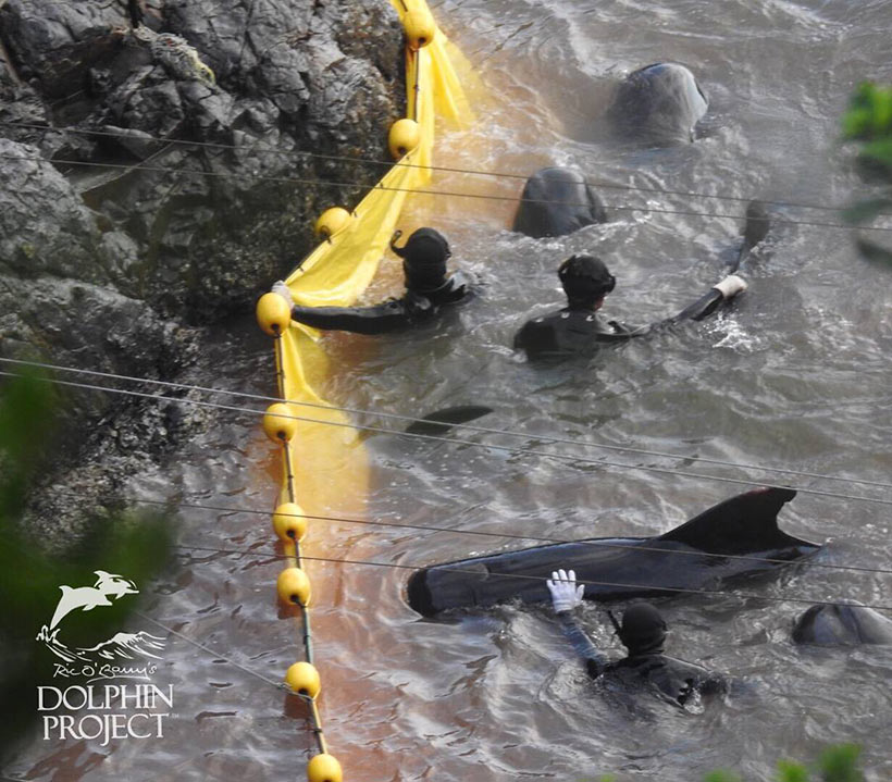 Kurz nach Sonnenaufgang kamen die Killer mit Booten in die Bucht. Planen wurden gezogen um dieses grausame Verbrechen vor der Öffentlichkeit zu verbergen. Die Pilotwale wurden aggressiv mit Booten mit ihren lauten, gefährlichen Bootschrauben in den Innenbereich der Bucht getrieben, dabei wurden viele Pilotwale von den Propellern verletzt. Das Abschlachten war ein Blutbad sondergleichen, die Misshandlungen übersteigen jegliche menschliche Vorstellungskraft.