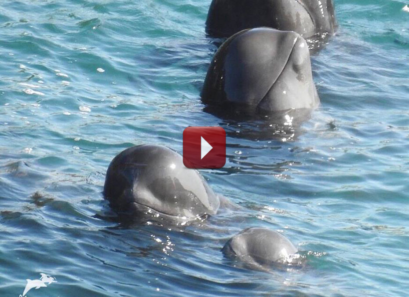 Als die Pilotwale in die Mitte des Aussennetzes getrieben waren, verliessen alle Boote die Bucht für Mittagspause. Die Pilotwal Famile fing an langsam wieder in die Bucht zuzurück zu schwimmen, alle eng aneinander geschmiegt, streckten ihre Köpfe (Spyhopping) aus dem Wasser und suchten in der Nähe der Planen nach ihren vermissten Familienmitgliedern. Die soziale Familienverbundenheit von Pilotwalen ist so gross, dass sie nichts aufhalten lies in das Blut ihrer Angehörigen zurück zu kehren. Die Szene vor der Bucht war so herzzerreissend, dass dies mit Text kaum beschreibbar ist. Bitte schauen Sie sich das Livestream Video an. Die Videoqualität ist nicht sonderlich gut weil es per internet gesreamt wurde, doch ist es erneut Beweis für die Gräueltaten an Delfinen in Taiji-Japan.