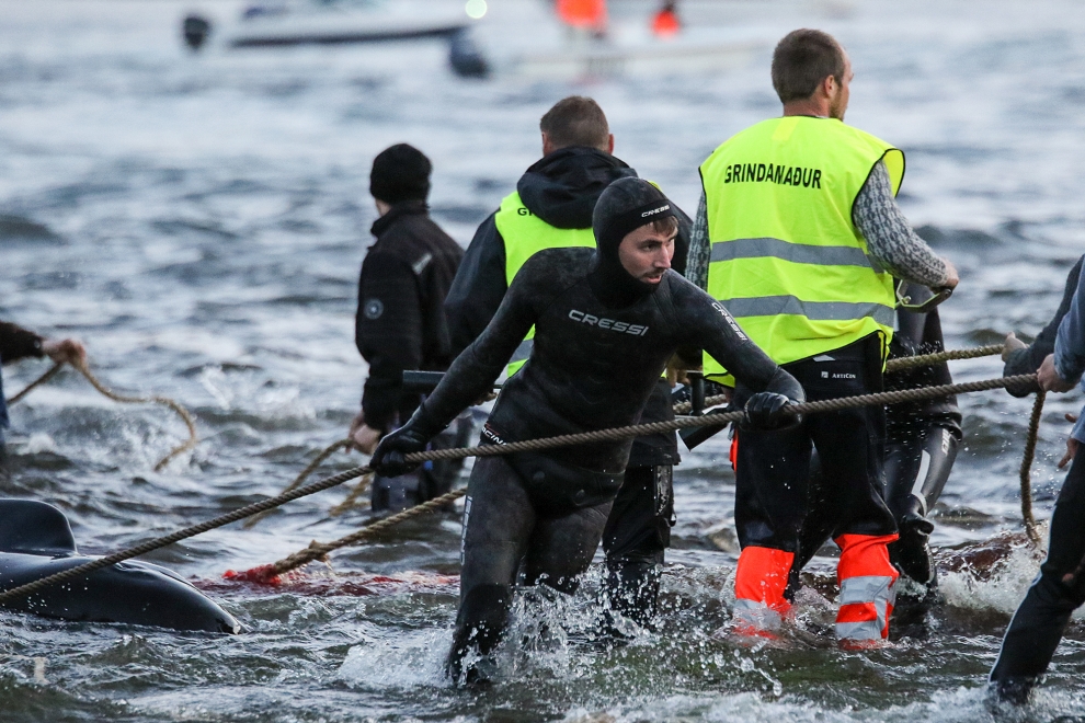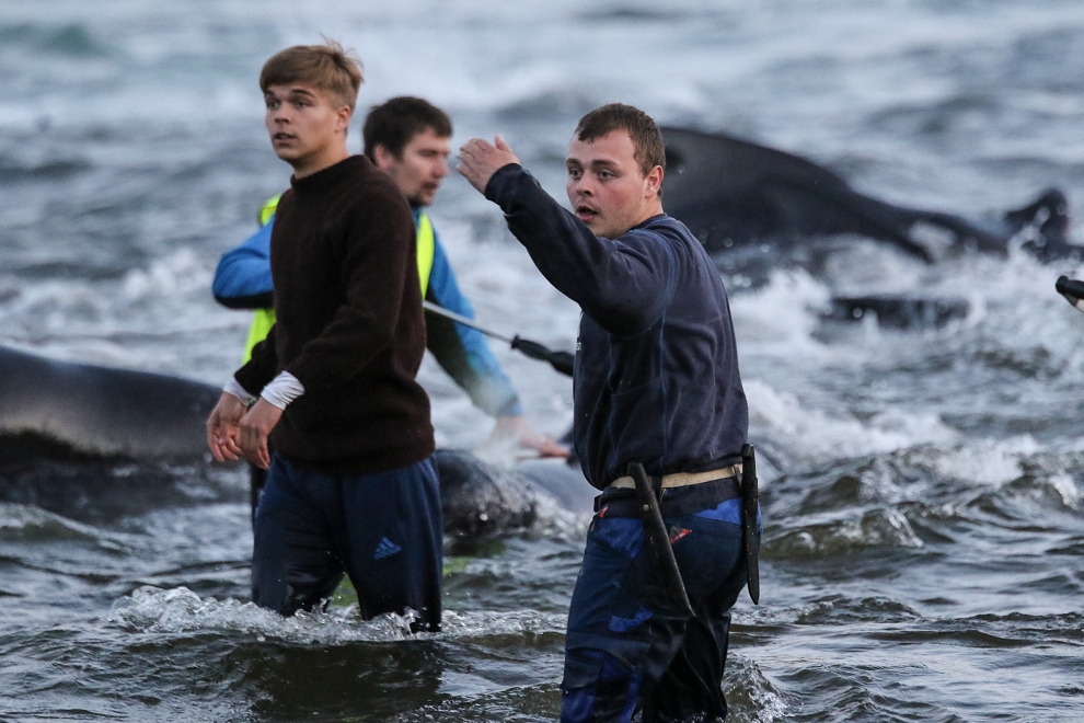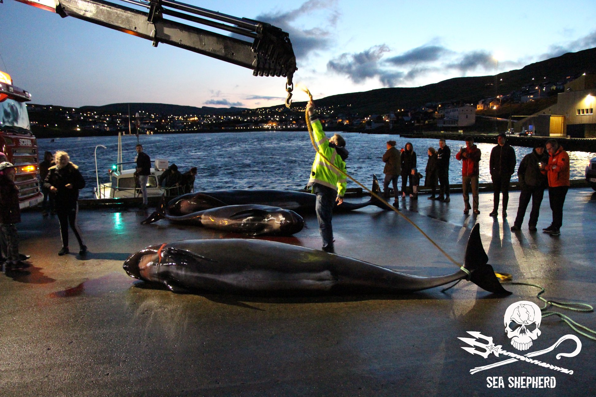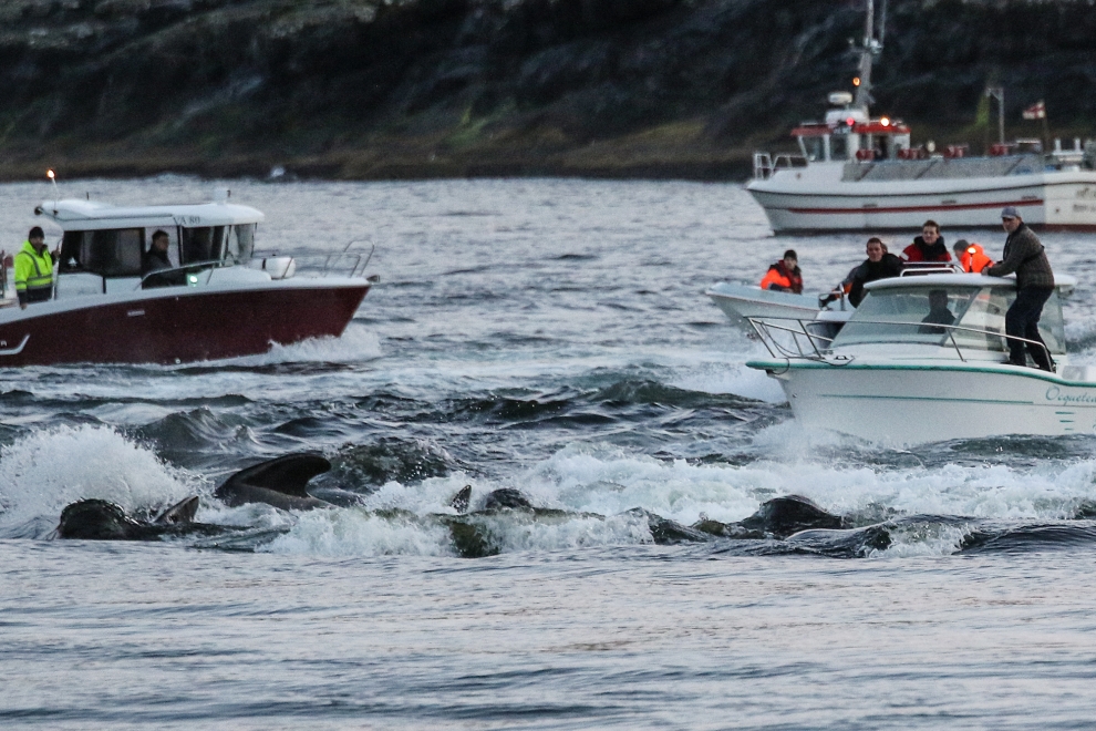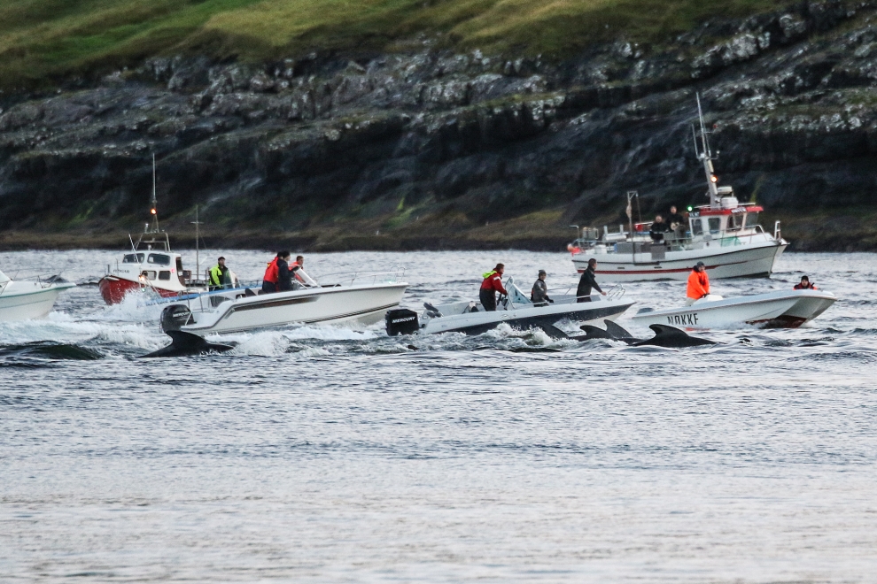 Färöische Boote, Speedboote, Jetskies, Luxusjachten schikanierten und zwangen eine grosse Pilotwal Delfinfamilie über 7 Stunden der SW-Küste entlang vor der Insel Vágar hoch und runter. Zuerst versuchen sie die Delfinfamilie in die Tötungsbucht von Sandavágur zu treiben, als sich die Delfine ihnen entgegenstellten, wurden sie dann hinauf nach Bøur und nun zurück nach Sandavágur getrieben, wo die ermüdete, geschwächte Delfinfamilie nun von mehr als 35 Booten zum Strand getrieben und getötet wurde.
