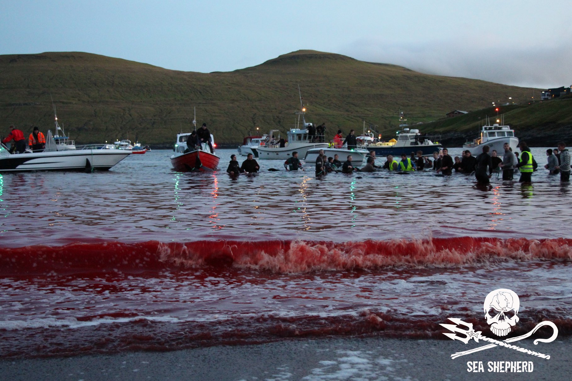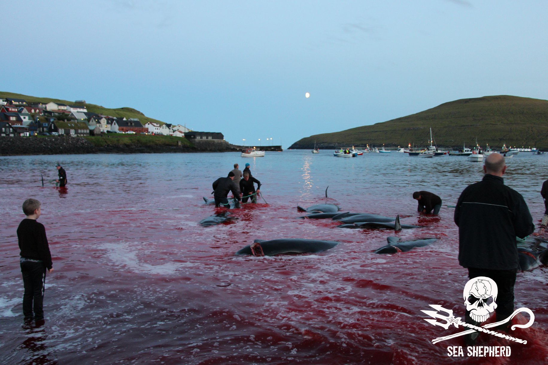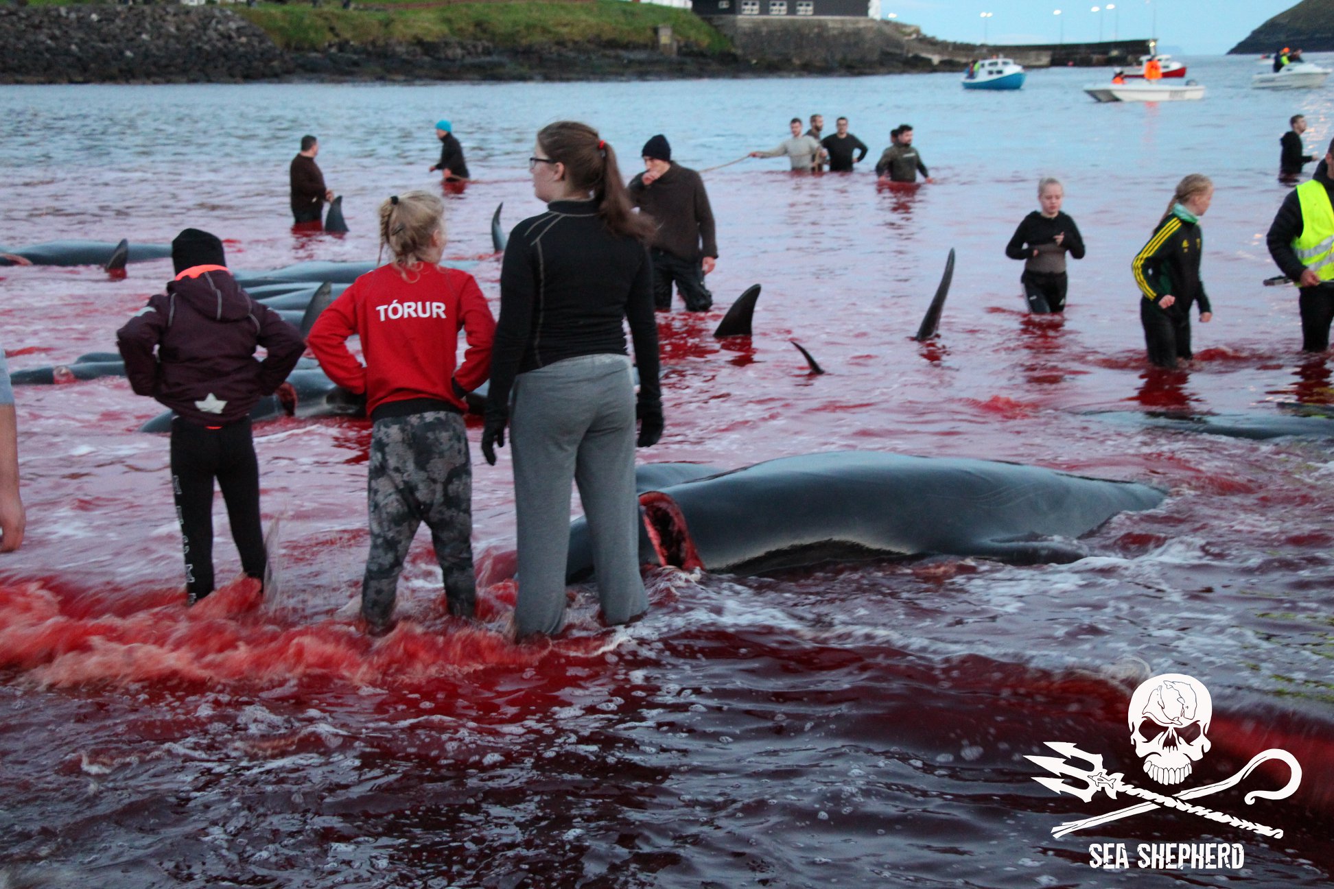 Kinder, Frauen und Erwachsene nahmen am Blood-Sport teil, es ist ihre alten Wikinger-Tradition zu morden; nicht für Fleisch für den Wintervorrat, wie fälschlicherweise in den Medien erzählt wird, das durch eine färöische Propaganda ausgelöst wurde. Delfinfleisch ist giftig und ungeniessbar, in den Färöer Inseln dreht sich’s nur ums gesellschaftliche Foltern und Töten wehrloser Opfer.