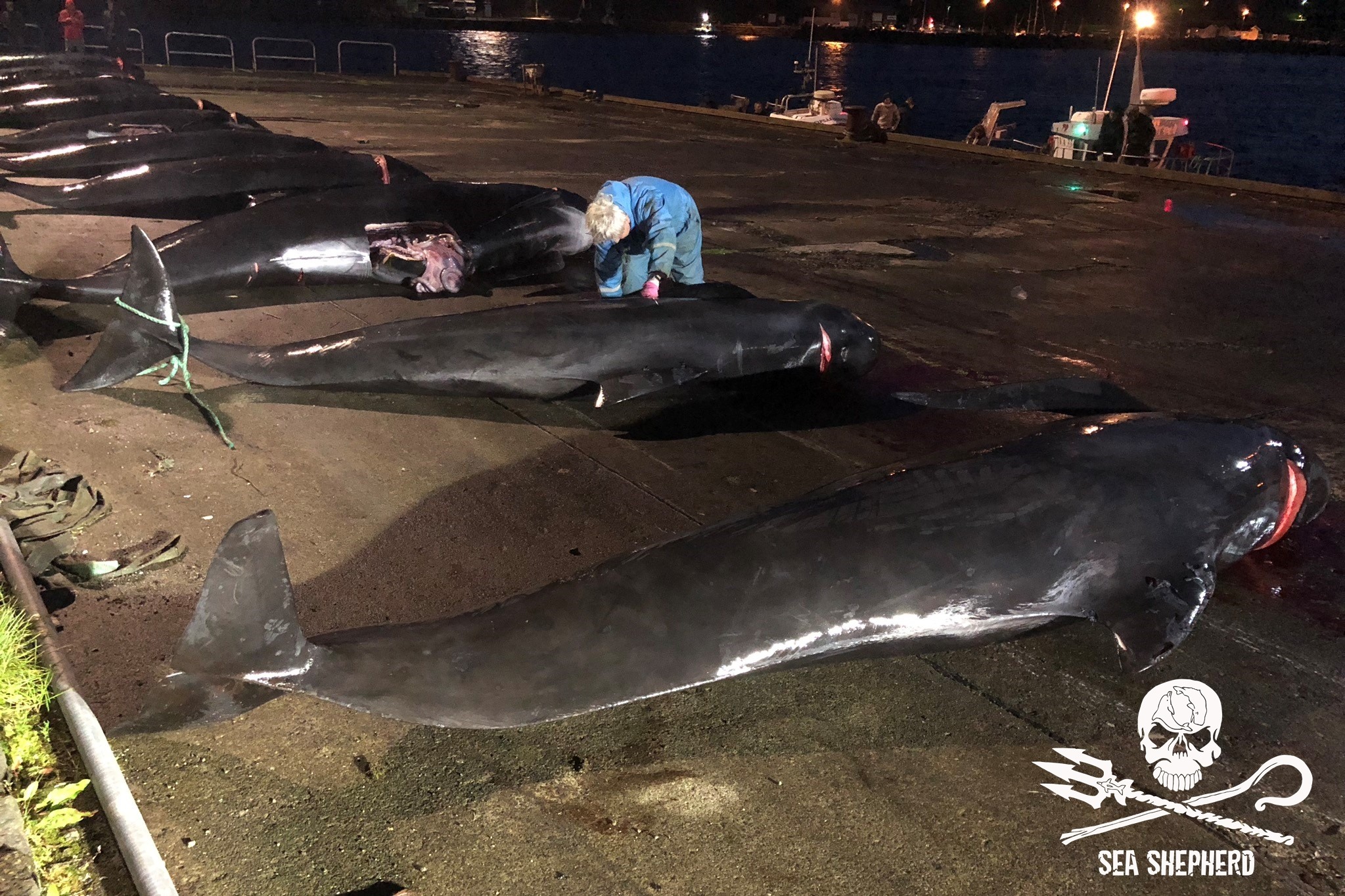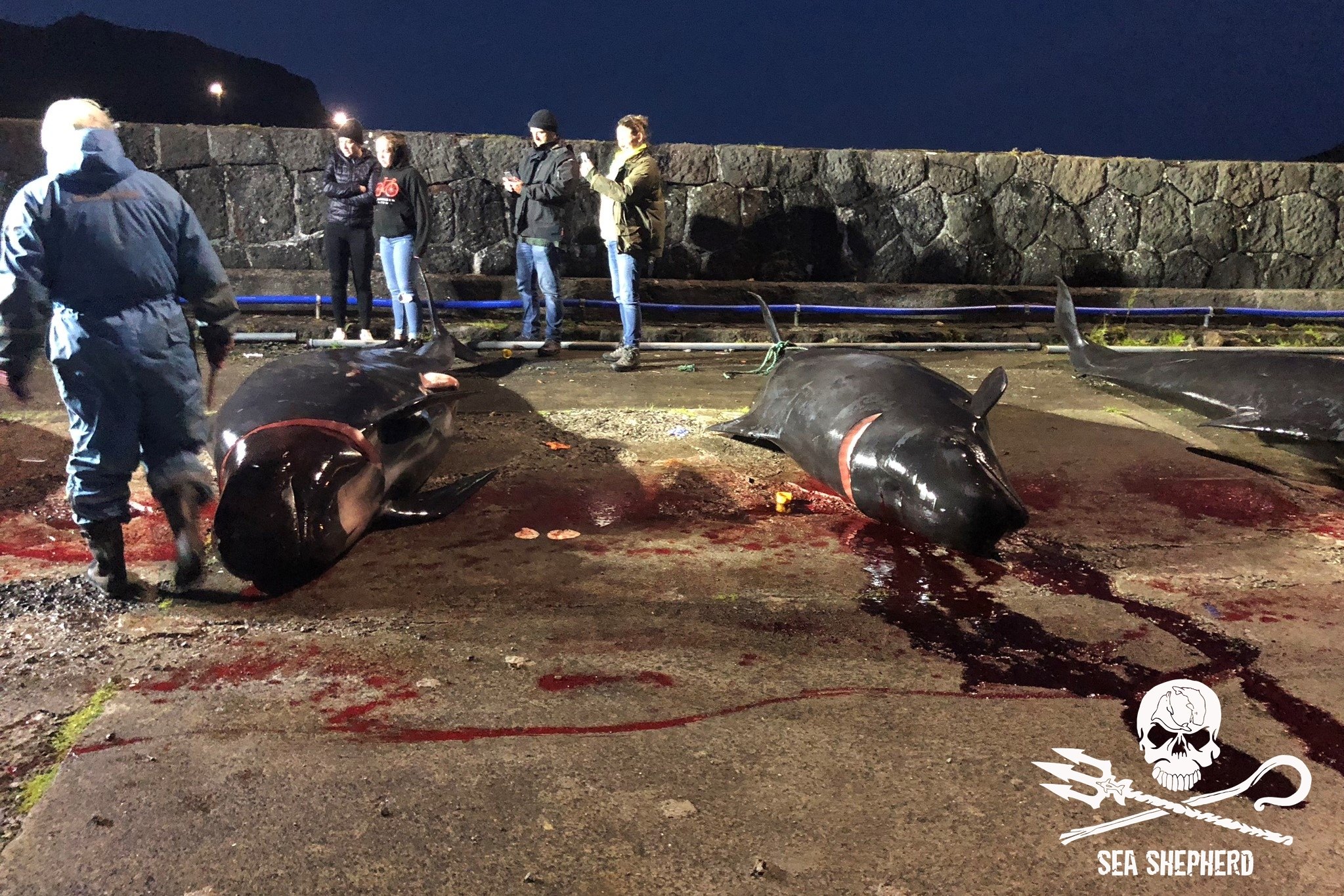 Wir gehen davon aus, dass einige Delfinbabys die siebenstündige Tortur nicht überlebt haben und ertranken. Nur schon die Tatsache, dass eine siebenstündige Treibjagd stattfand, zeigt doch die Schwere der Verbrechen an den wehrlosen Delfinen schon im Vorfeld bevor die barbarische qualvolle Schlachtung überhaupt anfängt.