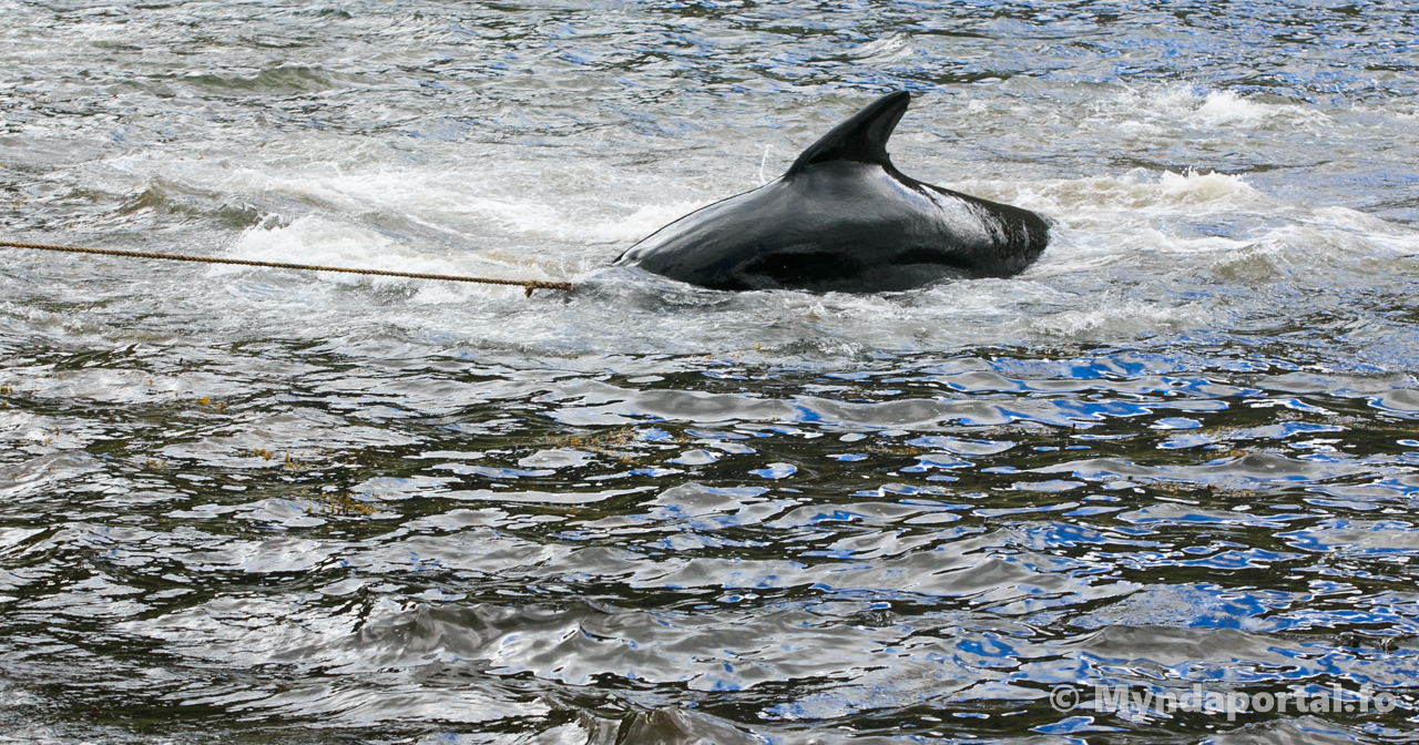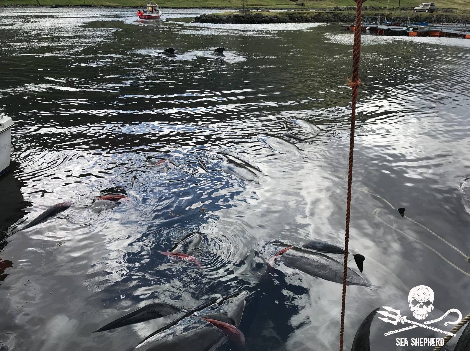 Eine gemischte Delfin Gruppe von 13 Atlantik Weissseitendelfine und über 80 Pilotwale haben heute während der Grindadrap-Jagd unvorstellbar schmerzhafte Grausamkeiten durch die Färöer erleiden müssen. Nur schon die unglaublich grausame Treibjagd durch Motorboote und Jetskies dauerte mehrere Stunden. Viele Babydelfine ertranken während der Treibjagd.