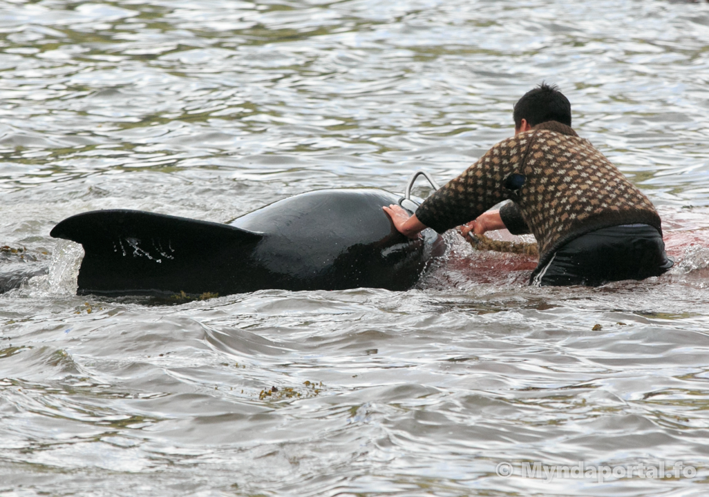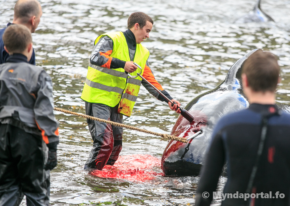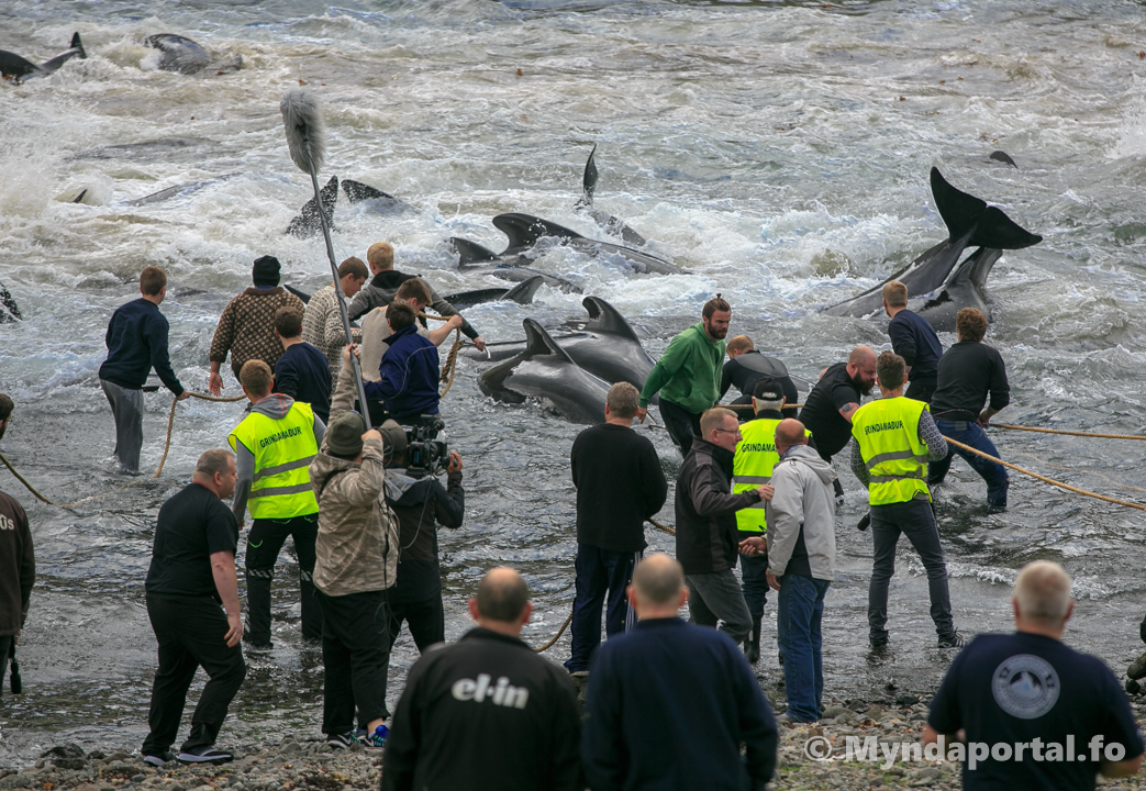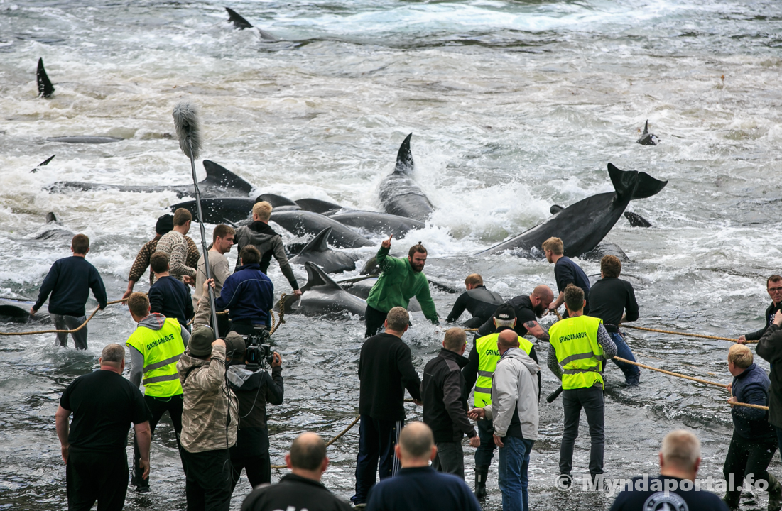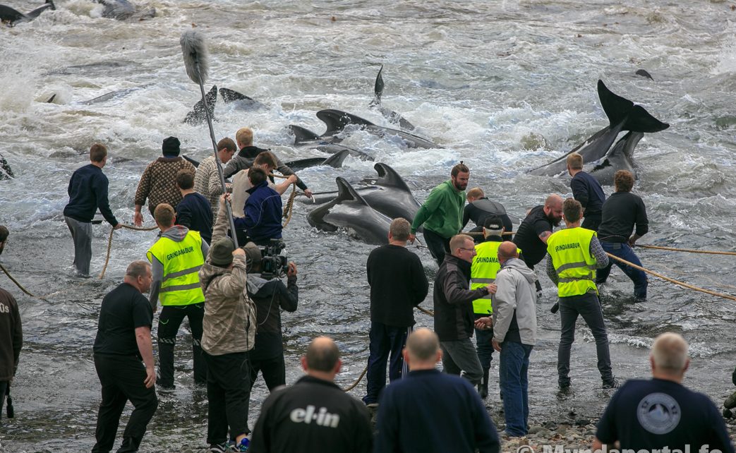 Rund 80 Langflossen-Grindwale, oder Pilotwale genannt, lateinisch Globicephala Melas, die zu den grossen Delfinen gehören, und 13+ Atlantische Weißwangendelfine wurden in den Färöer Inseln barbarisch abgeschlachtet. Drei Pilotwale, darunter ein Kalb und ein Delfin konnten sich den Mördern an der Küste für längere Zeit widersetzen. Nach erneuter wilder Jagd mit Booten wurden auch sie ermordet.