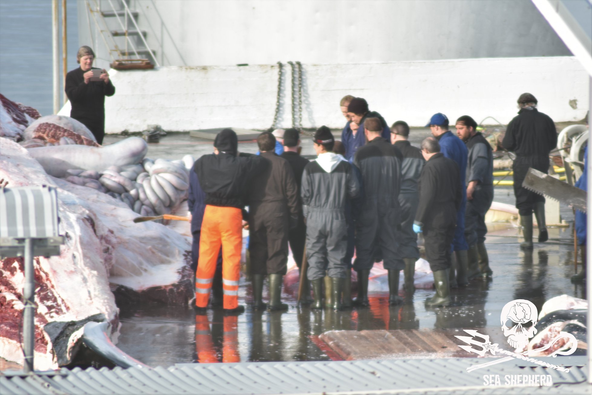 Ein weiterer schwangerer gefährdeter Finnwal wurde gestern von Hvalur hf getötet. Der ermordete Finnwal Nummer 103 bringt die Gesamtzahl illegal harpunierter trächtiger Finnwale auf 13. Die Arbeiter von Hvalur hf versuchten erneut den Fötus vor den Kameras von Sea Shepherd zu verstecken, posierten für ihre eigenen Fotos um das Ungeborene bevor sie ein menschliches Schild bildeten und den Fötus in einem Wagen wegbrachten.