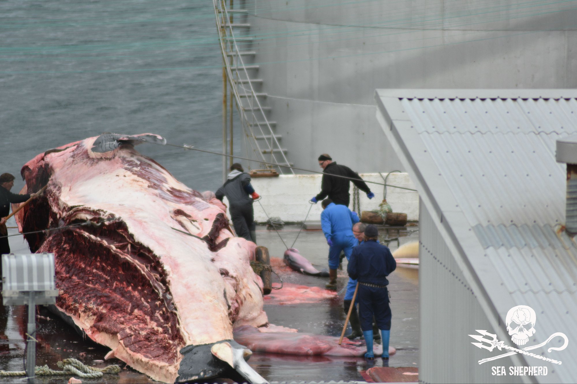 Ein weiteres trächtiges gefährdeter Finnwal Weibchen wurde von der Walfanggesellschaft Hvalur hf getötet. Die Arbeiter bildeten eine menschliche Wand um den Fetus des Finnwals Nr. 106 vor Sea Shepherd‘s Kameras zu verbergen.