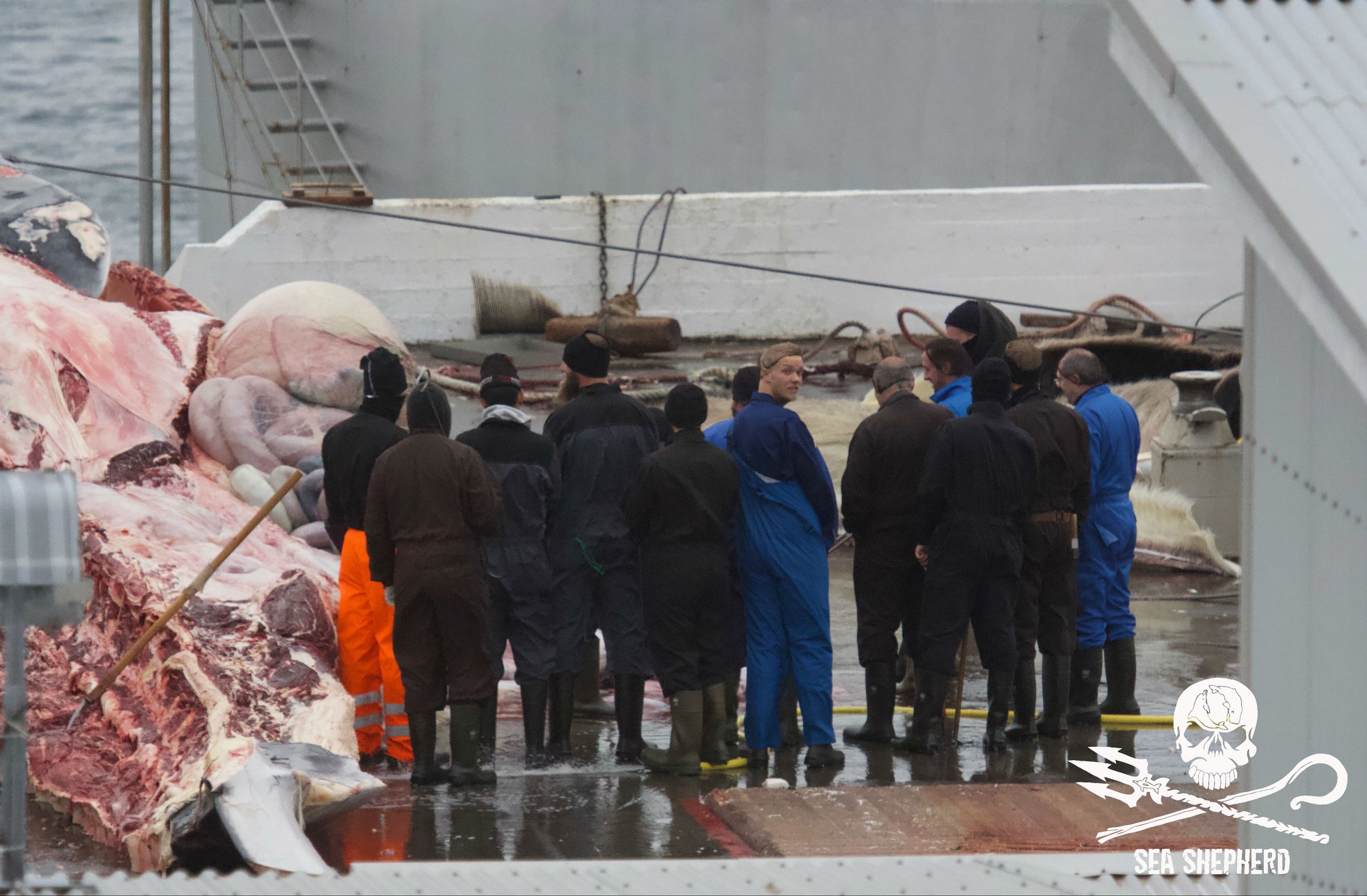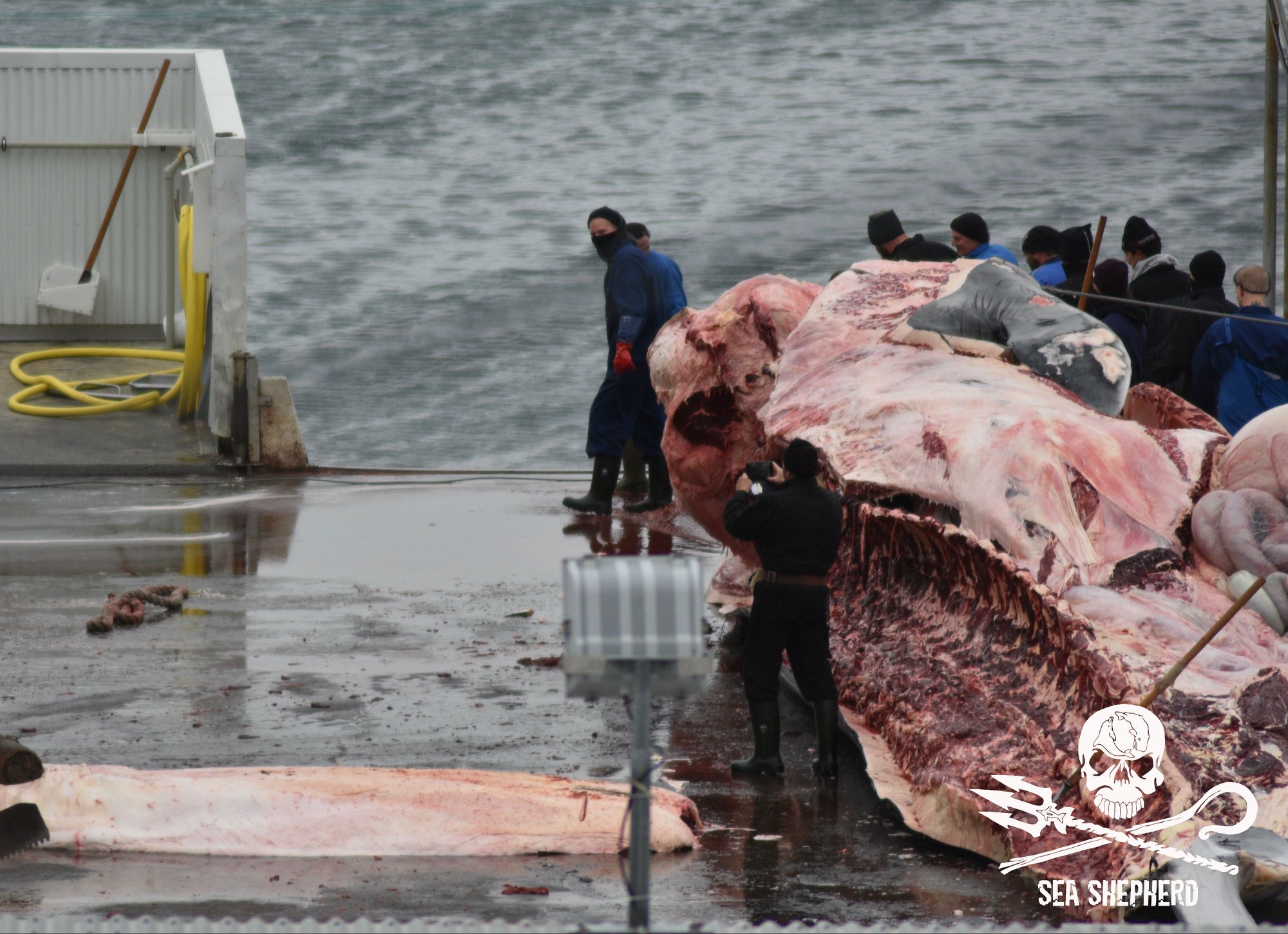 Die Darstellung dieses grausamen Schauspiels konnte die Sea Shepherd Crew nicht täuschen, letztendlich zeigten die Arbeiter ihre wahres Gesicht, ihre Respektlosigkeit gegenüber den gefährdeten Finnwalen, den ungeborenen Kälbern und den schwangerer Weibchen.
