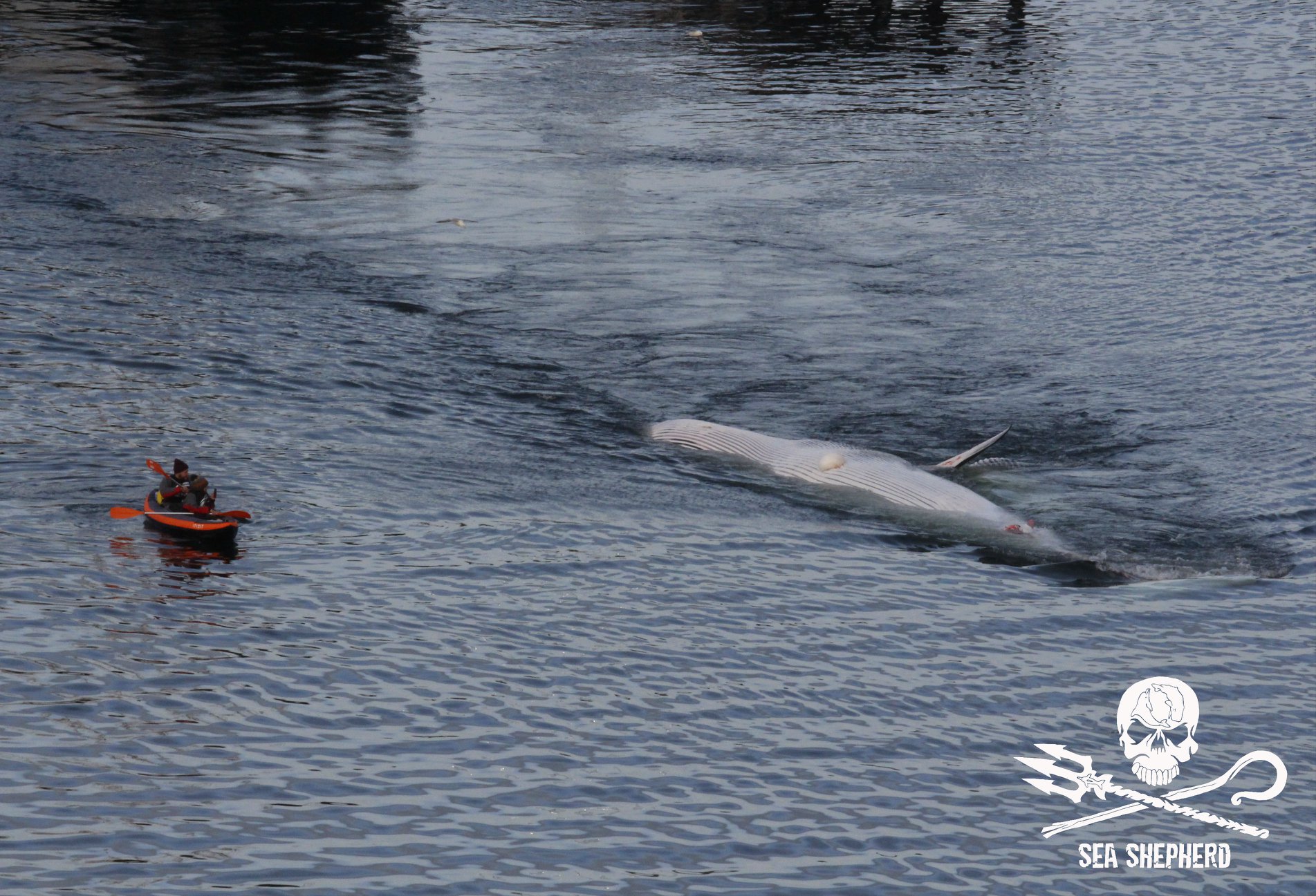 Die Sea Shepherd Crew fuhr mit einem Kajak neben den ermordeten Finnwalen 110 & 111, als sie von Hvalur 8 zur Hvalur Hf Walfangstation gebracht werden. Die Sea Shepherd Crew Filmte für livestream Vidos und fotografierte die ermordeten Wale in nächster Nähe, sie identifizierten den ermordeten vom Aussterben bedrohten Finnwal Nr. 111 als einen jungnen, nicht-ausgewachsenen Wal.