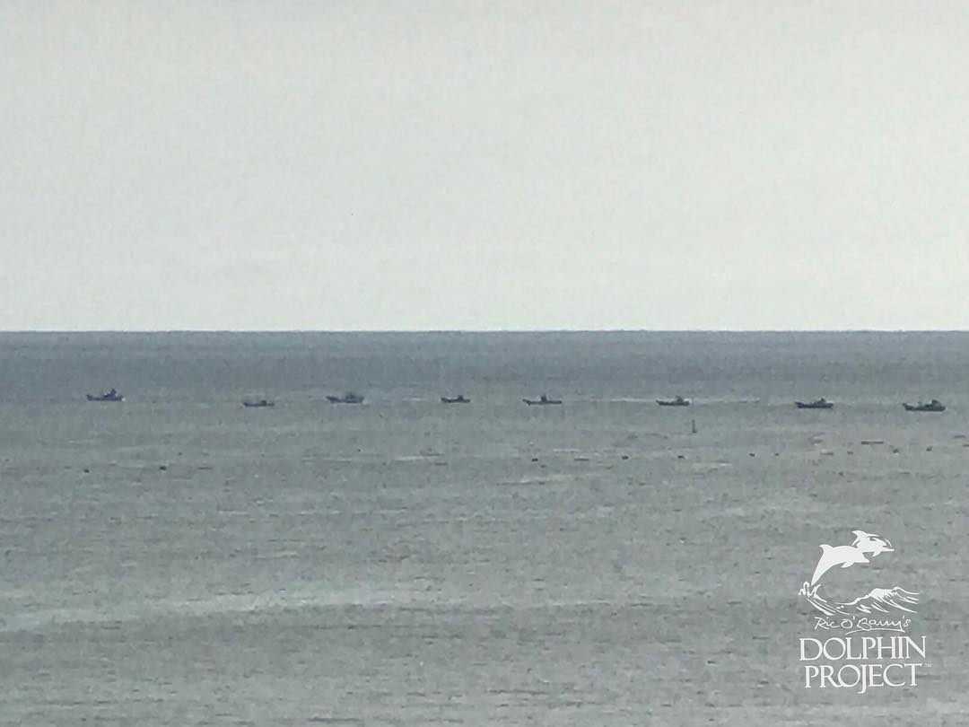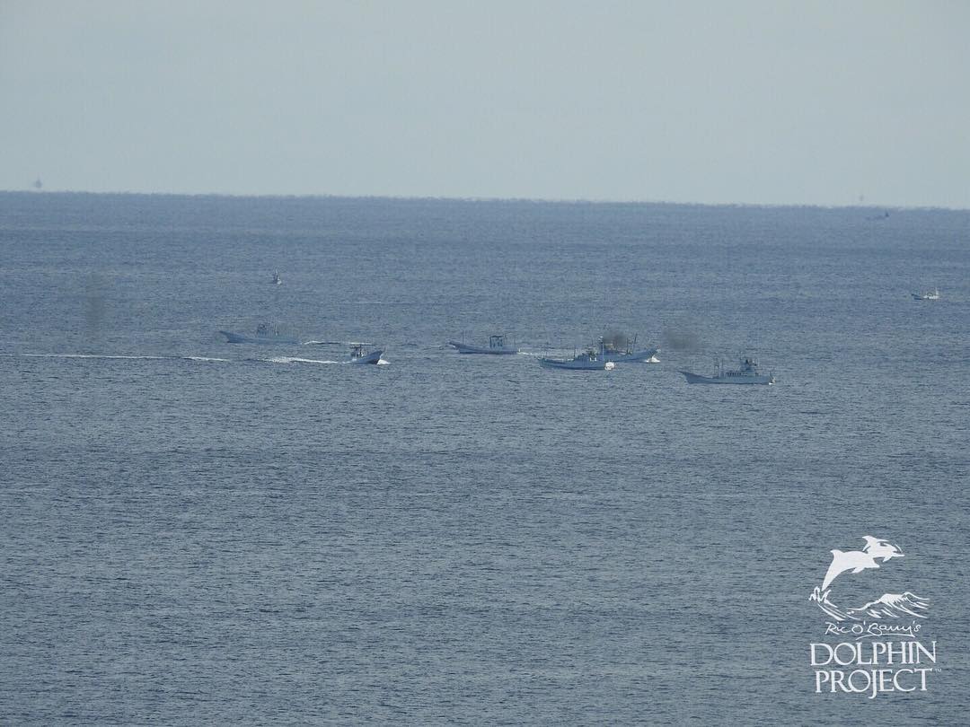 Die Delfinjäger terrorisierten diese Delfinfamilie über drei Stunden lang, nur schon zwei Stunden vor dem Eingang zur Bucht. Das Dröhnen der Motoren der 14 Motorschiffe und das Hämmern auf Eisenstangen die ins Wasser ragten um die Sinne der Delfine zu stören war ungeheuerlich laut. Immer wieder tauchten die Delfine ab, soviel und lange wie keine Delfine zuvor. Die geistesgestörten Killer waren ersichtlich extrem wütend und aggressiv, wie die Verrückten rasten sie mit ihren Schiffen hin und her, um die Delfine im Kreis herum und manchmal auch über sie hinweg.