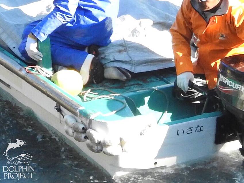 Die Streifendelfin Familie drängte sich verängstigt in ihrem letzten Moment als Familie vor dem Tod nochmals zusammen. Die Killer attackierten die Delfine mit ihren Bootsmotoren um sie unter die Planen in der Bucht in den Tod zu drängen. Daraufhin kamen die Delfine in Panik, schwammen ins Netzt und einige verfingen sich wie üblich darin und viele verletzten sich schwer an ihrem Rostrum (Nase und Mund). Die Mörder musste das Netzt anheben um einige verwickelte Delfine zu befreien, dabei huschten ein paar Delfine unter dem Netz durch. Doch sie schwammen nicht vom Netz weg, sie wollten bei ihren Familienmitglieder bleiben. Es sah so aus, dass die mit den anderen Delfinen auf der anderen Seite des Netzes kommunizierten.