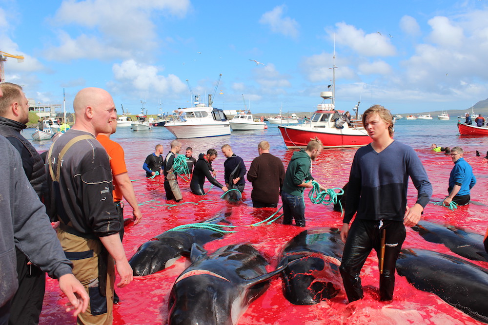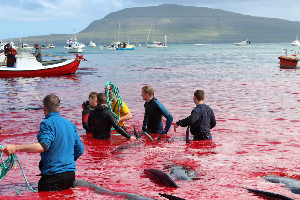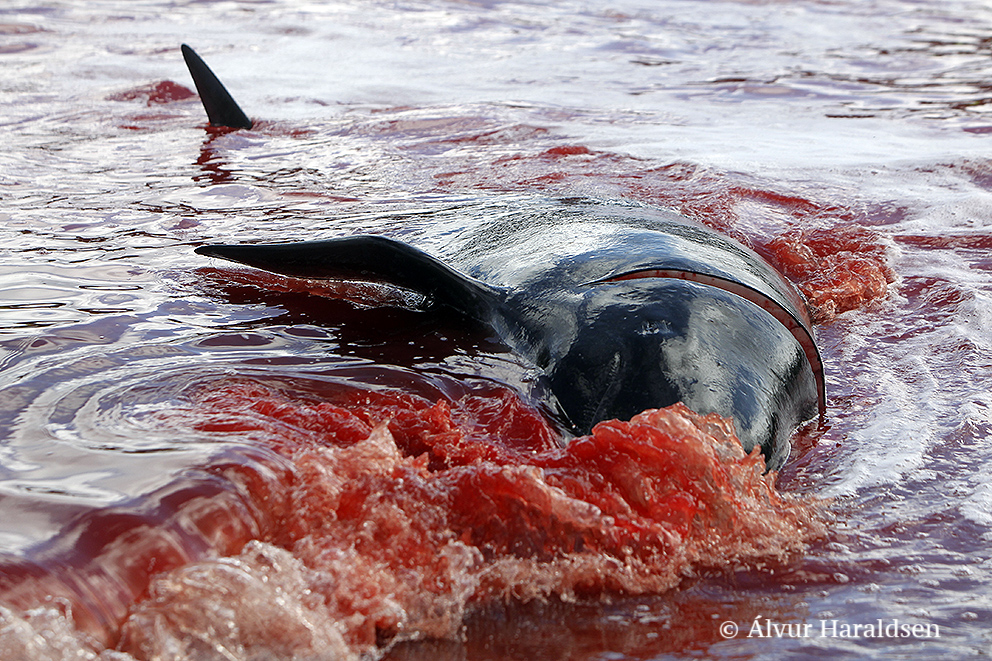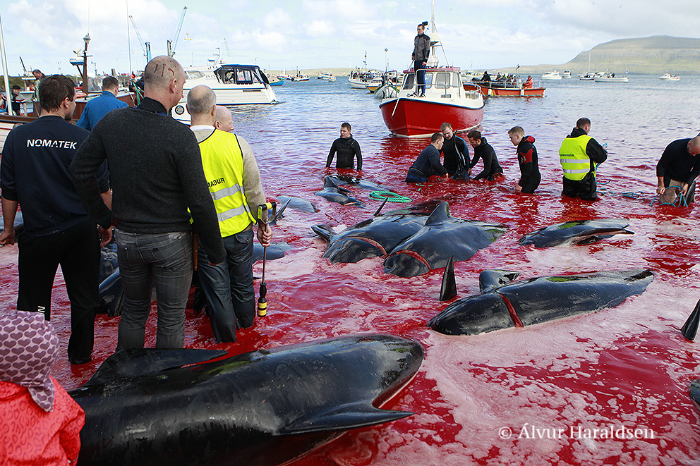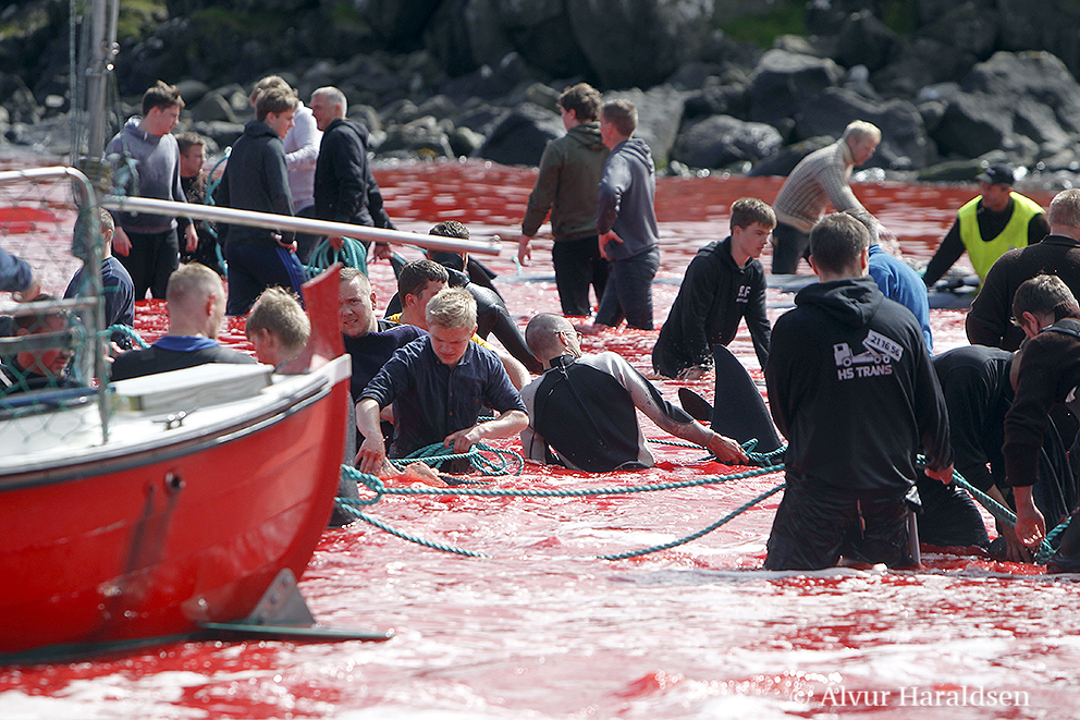 Viele Schaulustige waren vor Ort, viele von ihnen, diejenigen die diese Delfinfamilie über stunden verfolgten und zum Stranden brachten, sowie viele Mörder schossen mit ihren Mobile Phones Selfies wie die Verrückten um damit in den Medien zu protzen. Wie stolz muss ein Färöer sein, in der Welt damit zu prahlen, wie den wehrlosen sanften Wesen zuerst die Wirbelsäule zerstört, danach noch lebend mit langen Messern der Nacken aufgeschlitzt wird.