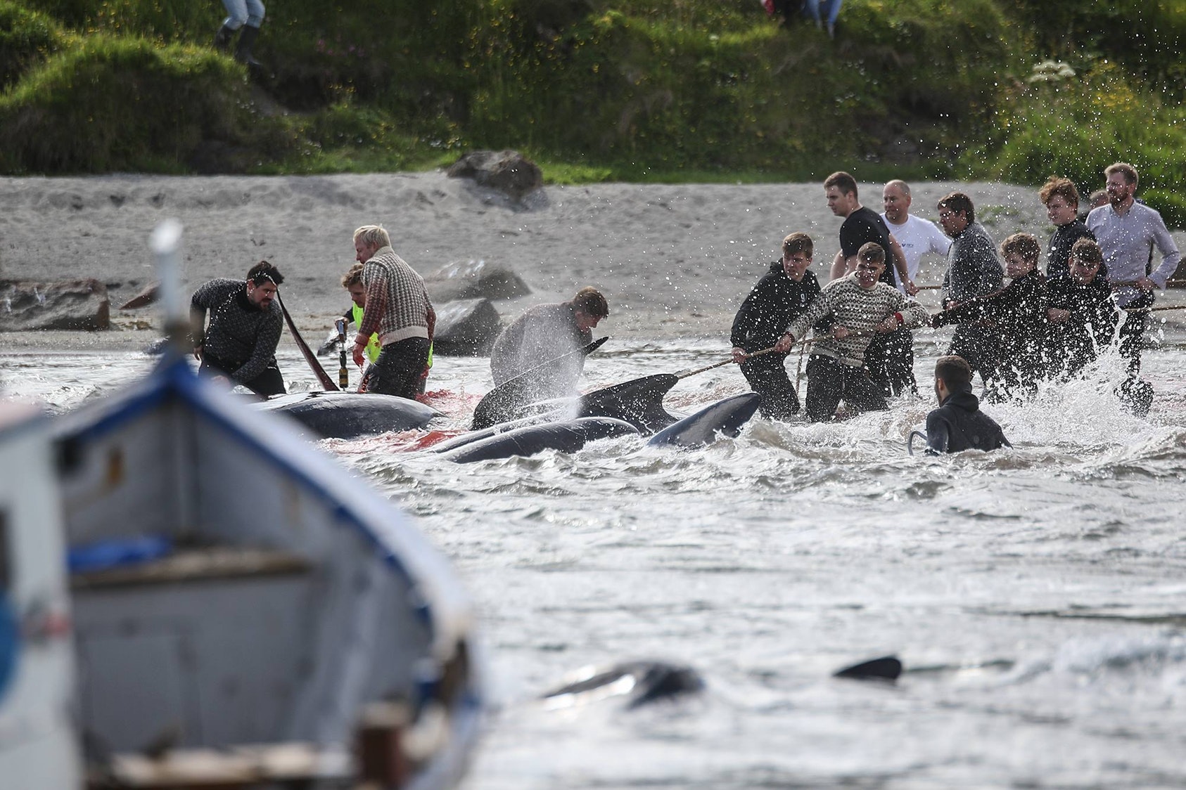 Färoer Medien berichteten heute: "Freude am Strand von Tórshavn, färöische Walfänger töten 51 Grindwale."
