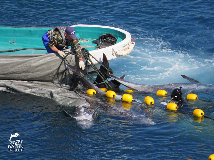 „Trainer“ versuchten mehrere Male den ganzen Tag über die acht gefangenen Delfinkinder, die in der Bucht im Hafen gefangen gehalten werden, mit toten Fischen zu füttern. Die Delfine wollten das ungewohnte „Futter“ nicht akzeptieren, sie sind sich die Jagd nach frischen und lebenden Fischen gewohnt oder andere von ihnen säugten noch Muttermilch.
