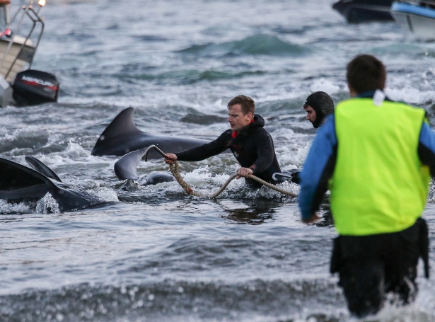 Nach mehreren Stunden Treibjagd drückten die Monster mit ihren Boote die Meeressäugerfamilie an den Strand von Sandavagur zum Stranden. Eine mit Hacken und Messern bewaffnete Meute stürzte sich auf die wehrlosen und völlig erschöpften Meeressäuger, steckten ihnen Hacken ins Blasloch, zogen sie mit Seile weiter ans Ufer ran, zertrümmerten ihnen mit einer Lanze das Rückenmark und zerschnitten ihnen mit scharfen Messern den Nacken. Die meisten Delfine sterben nicht gleich an diese schweren Verletzungen, sie leiden manchmal viele Minuten lang bis der Tod eintritt. Viele male konnten wir Video-Dokumentarisch belegen, dass Delfine mit gebrochener Wirbelsäule und aufgeschlitzten Nacken noch lange unter grössten Schmerzen gegen den Tod kämpften, später wiederholt gab ein Monster mit einer Lanze den zweiten Todesstoss, der auch nicht immer gleich zum Tode führte.