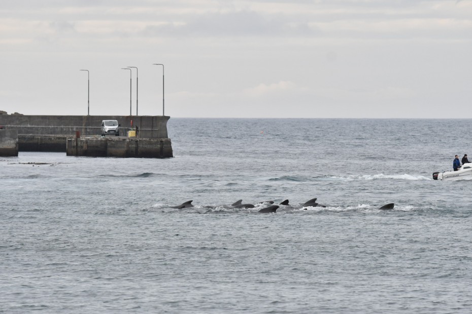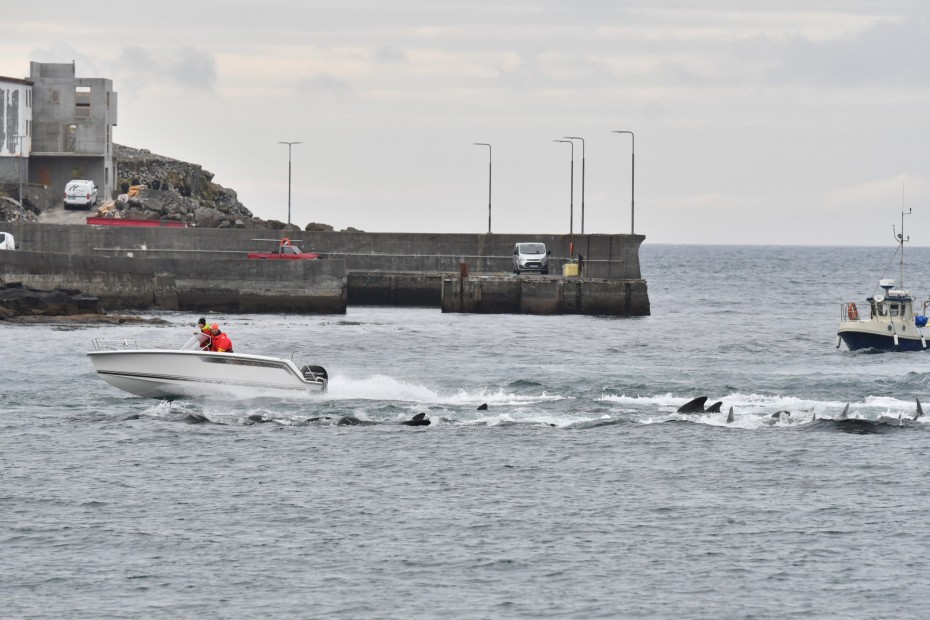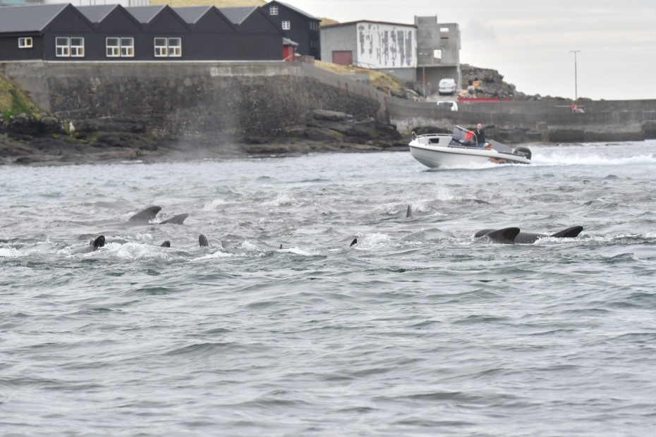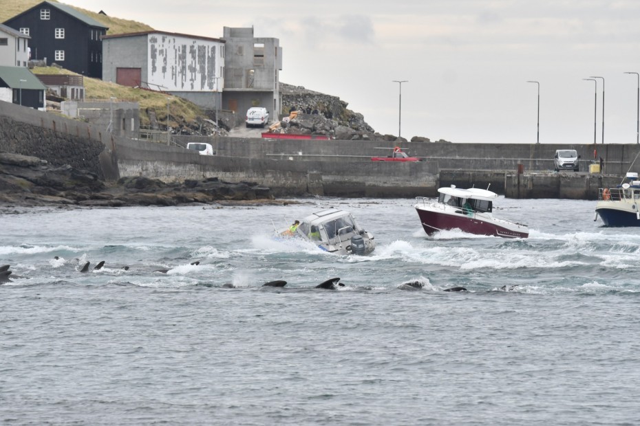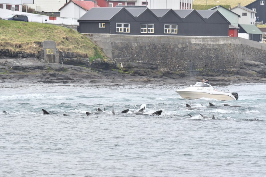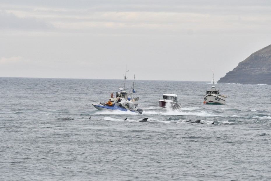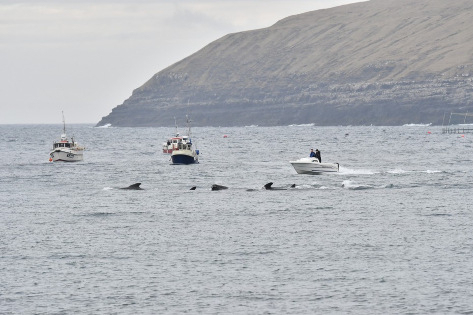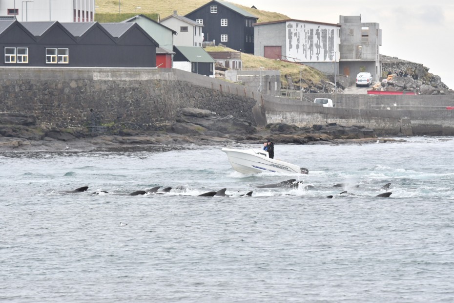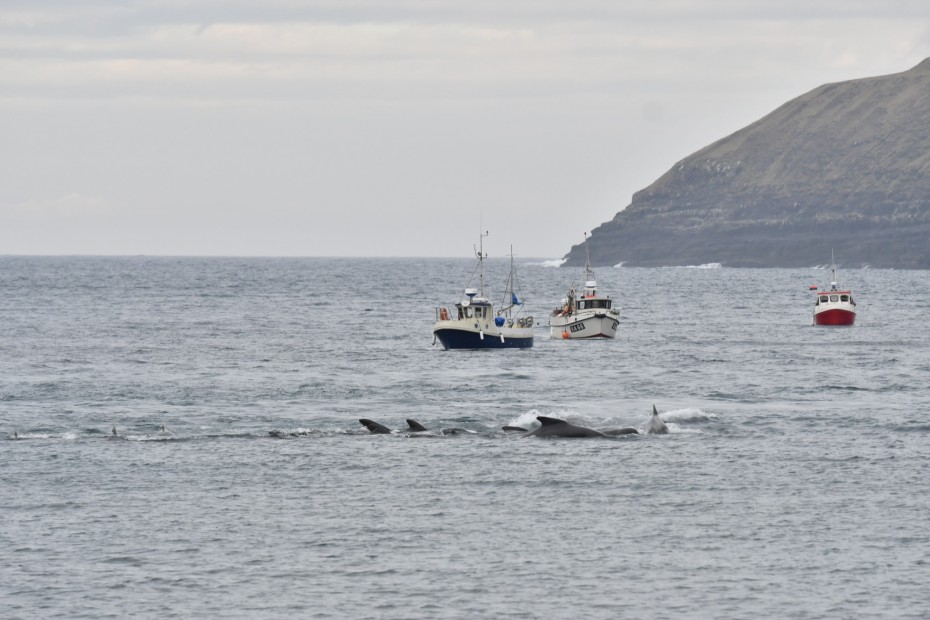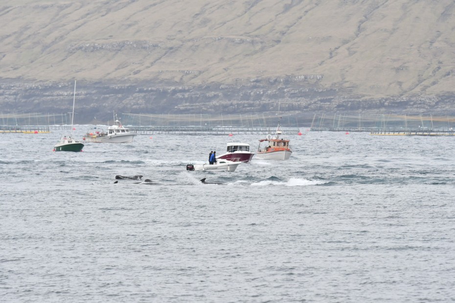 Der Captain eines färöischer Fischerei Trawler entdeckten heute Morgen um 7 Uhr die Delfinfamilie und meldete die Sichtung seiner direkten Konkurrenten für Fisch dem Festland. Daraufhin fuhren 24 private moderne Schnellboote zu den Pilotwalen hinaus und fingen gleich an diese Delfine brutal mit ihren Booten zu terrorisieren.
