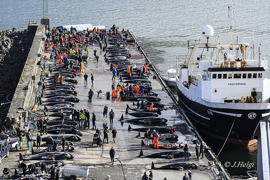 105 Pilotwale wurden heute Morgen in Sandavagur auf der Insel Vagar im westlichen Teil des dänischen Archipels abgeschlachtet. Dies ist der 2. Grind in diesem Jahr, getötet wurden Erwachsene Delfine, Junge, Säuglinge, Schwangere und ihre ungeborenen Babys (Föten) - Europas Schande!