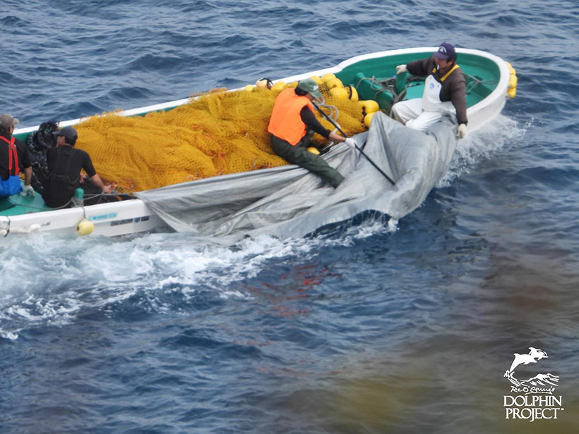 Nachdem nach ungefähr einer halben Stunde, unter den Planen vor der Öffentlichkeit verdeckt, das Flossenschlagen sterbender Risso‘s Delfinen verstummte, fuhren Boote mit den Delfinleichen im Schlepptau unter den Planen heraus. Die ermordeten Delfine waren mit Planen abgedeckt, mit der Absicht, ein weiteres Verbrechen in der japanischen Bucht vor den Kameras der Berichterstatter, Dolphin Project Monitors, und der Öffentlichkeit zu verstecken.