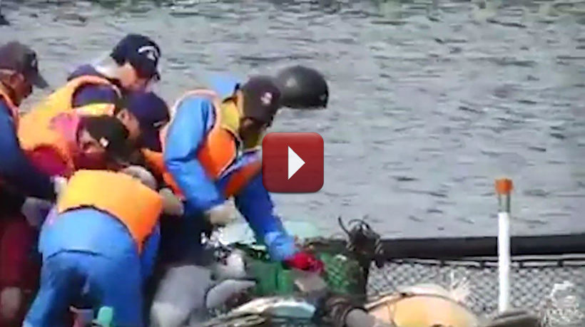 Sieben Weißseiten Delfine wurden erfolgreich von Killern und Trainern gemeinsam in die Boote gerissen. In mehreren Fahrten transportierten sie die entführten Meeressäuger zu den die Käfige im Hafen und warfen sie auf ähnlich brutale Gewalt hinein wie sie diese Säugetiere zuvor ins Boot gerissen hatten.