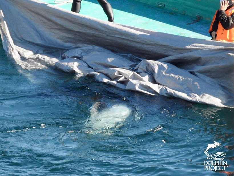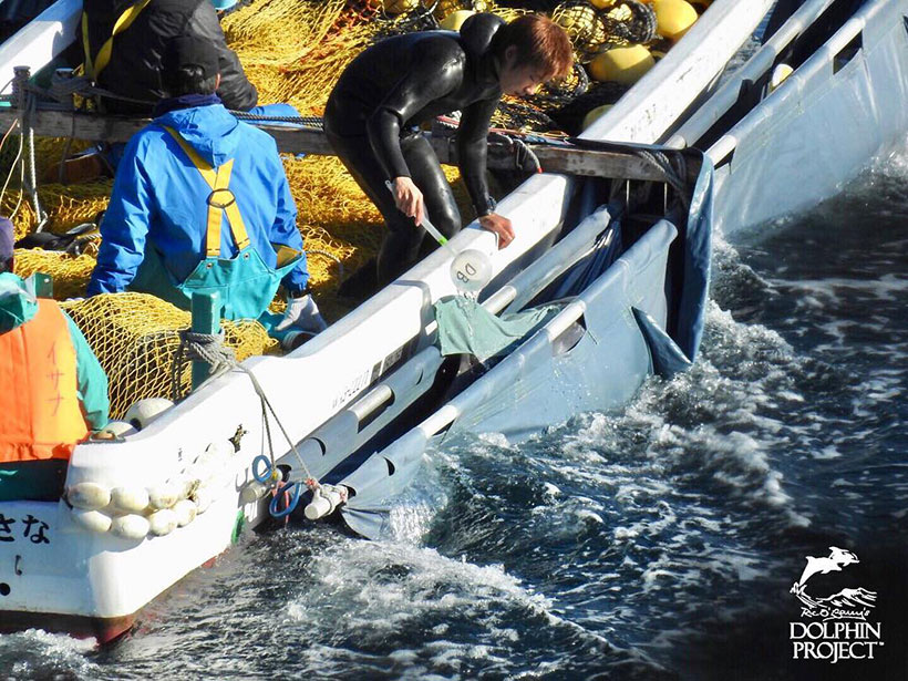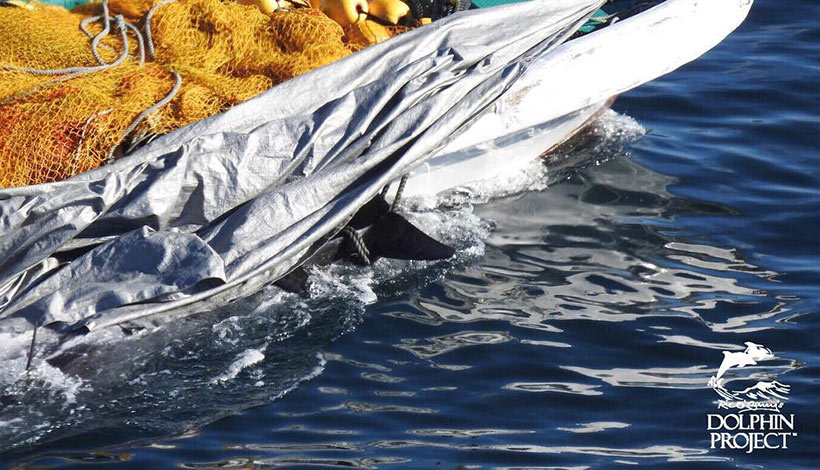 Später fuhren mehrere Boote nacheinander in fünfminütigen Abständen unter den Planen heraus. Die ermordeten Risso’s Delfine waren mit einem Seil an der Schwanzflosse an den Booten angebunden von den Killern ins Metzgerhaus geschleppt, wo sie für Fleischplatten und Sushi zerhackt oder weil ihr Fleisch giftig ist in Abfalltonnen geschmissen. Ein kleines Delfinbaby befand sich unter den ermordeten Delfine.
