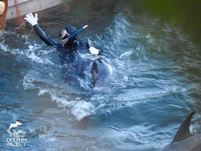 Als die Trainer in die Bucht eingefahren waren begannen fünf Booten der Killer die sanften empfindungsfähigen Säugetiere zu attackieren und an den Strand zu terrorisieren. Taucher markierten zuerst die auserwählten Delfinkinder die sie für den Verkauf an Delfinarien zu stehlen beabsichtigten, dann wurde jeder einzelne nacheinander ans Ufer gezerrt.