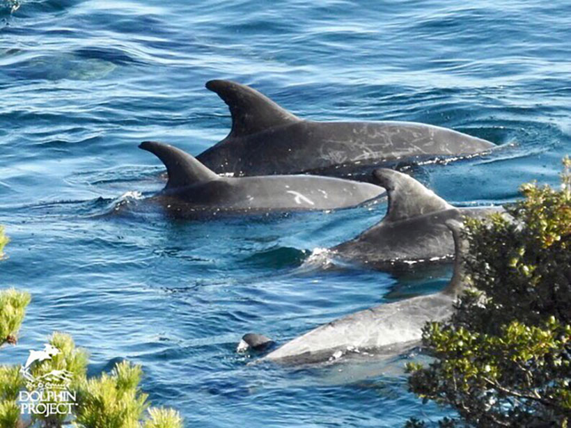 Bild: Risso's Delfine kurz nach der Treibjagd noch als Familie, ein kleines Rückenflösselchen eines Babydelfins ist zu erkennen.