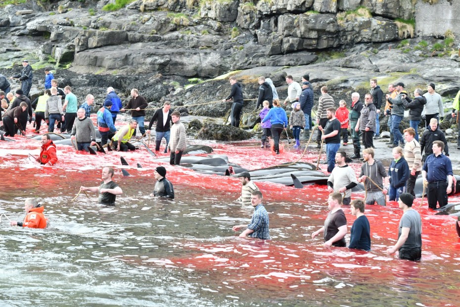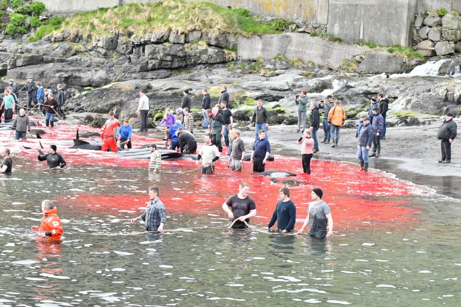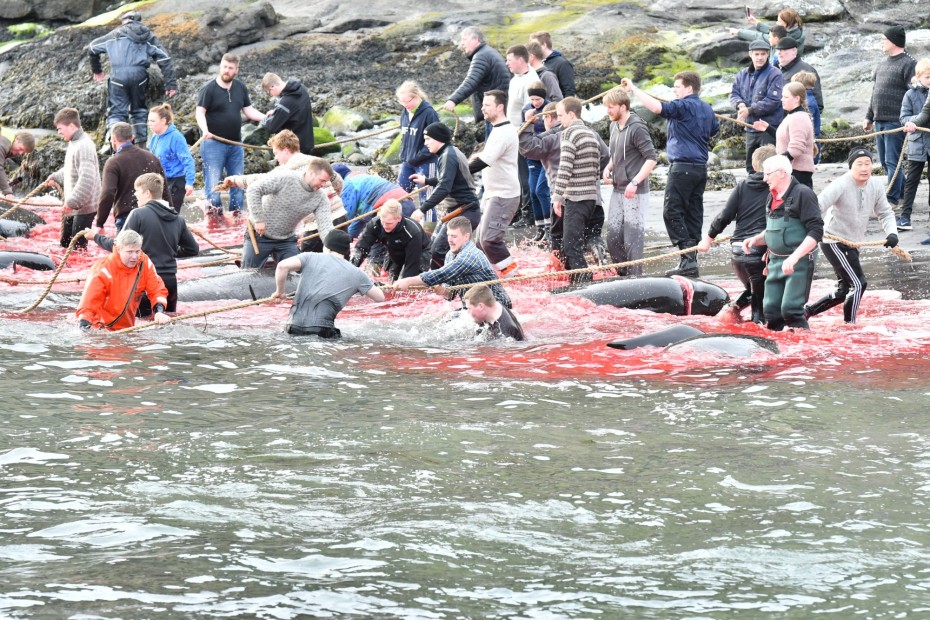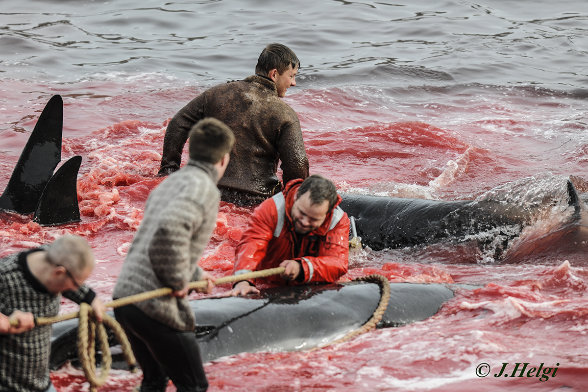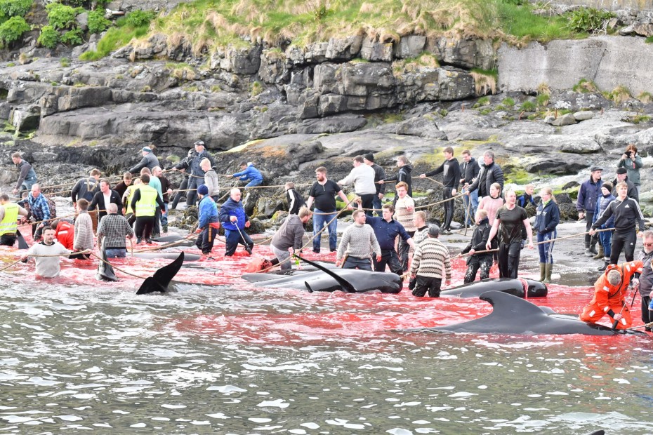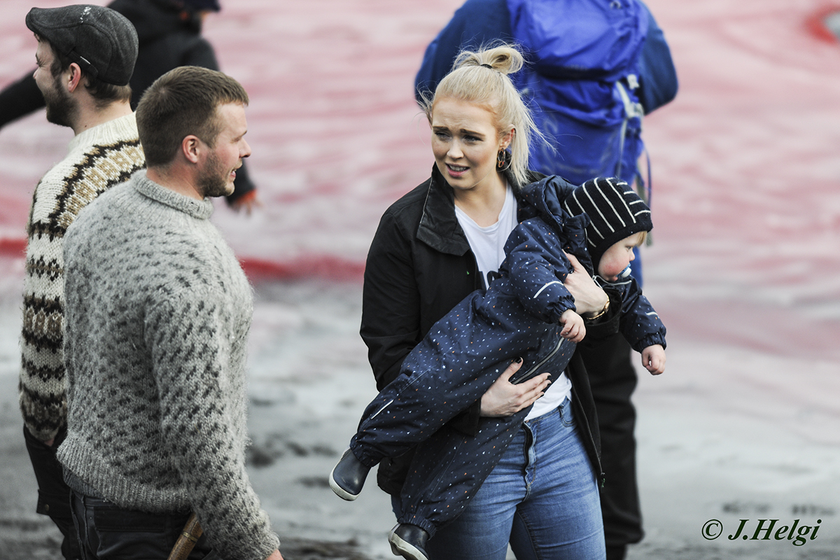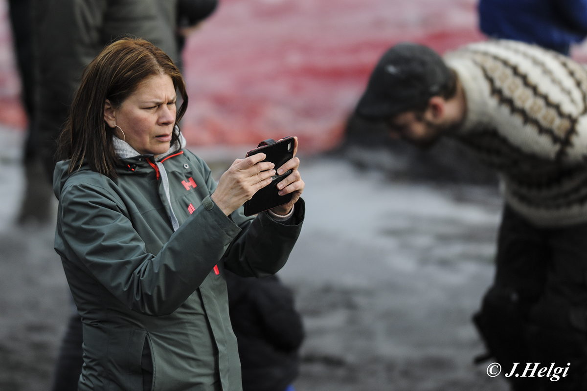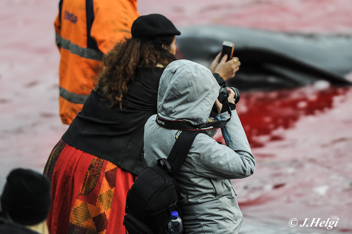 Indische Touristen waren am Delfin Massaker anwesend. Wir wissen nicht wie sie darauf reagierten, jedenfalls machten sie Fotos während des grausamen Mordens. Auch Färöische Frauen mit Kleinkindern waren anwesend, sie machten den Anschein, als würden sie das grausame Blutbad geniessen. Bei den Treibjagden und Tötungen von Delfinen geht es nicht um Nahrungsbeschaffung, es îst ihr tratitioneller Blutsport.