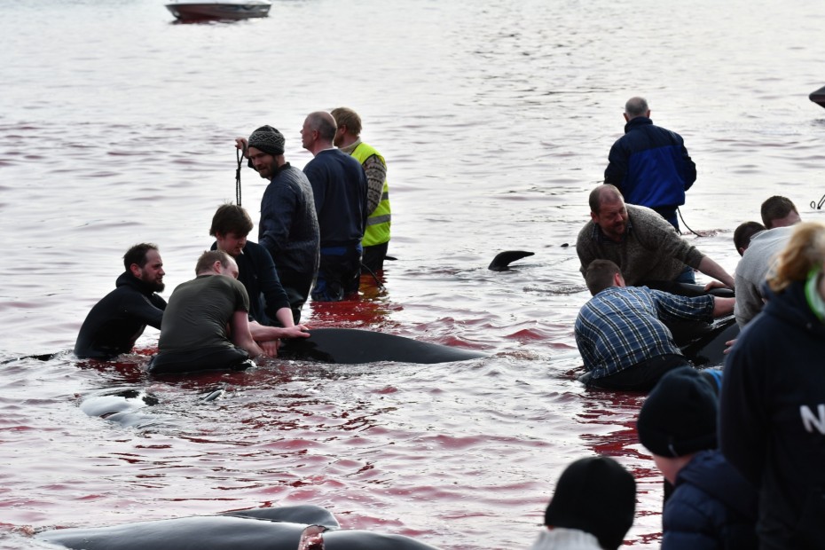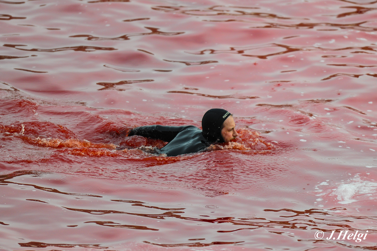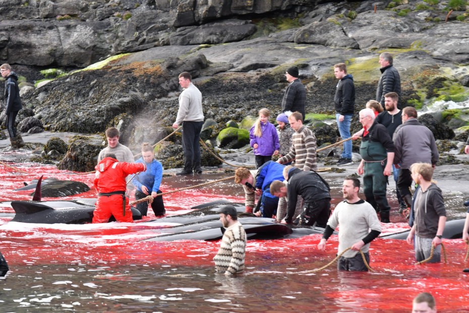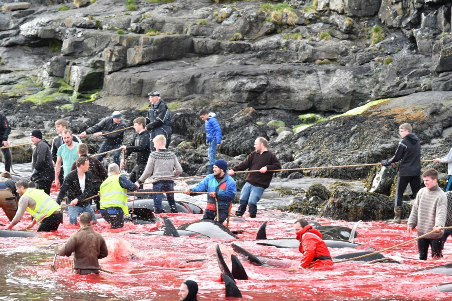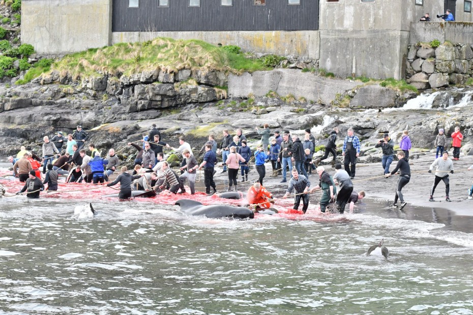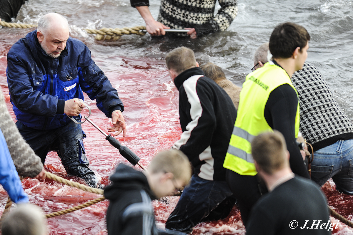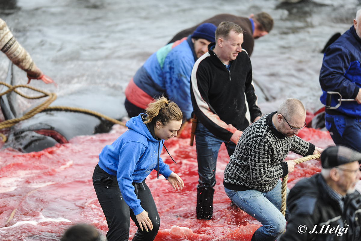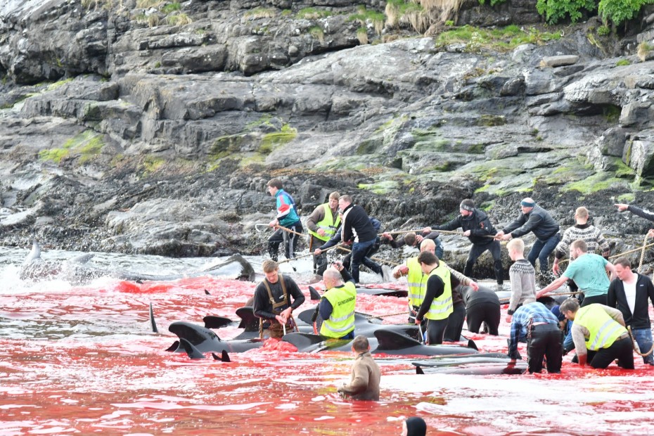 Indische Touristen waren am Delfin Massaker anwesend. Wir wissen nicht wie sie darauf reagierten, jedenfalls machten sie Fotos während des grausamen Mordens. Auch Färöische Frauen mit Kleinkindern waren anwesend, sie machten den Anschein, als würden sie das grausame Blutbad geniessen. Bei den Treibjagden und Tötungen von Delfinen geht es nicht um Nahrungsbeschaffung, es îst ihr tratitioneller Blutsport.