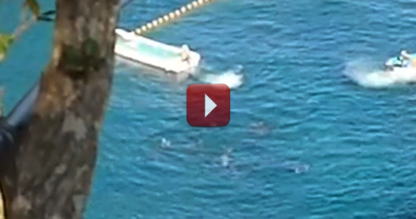 Bild: Nach der vierstündiger brutaler Treibjagd durch 12 grosse Jagschiffe die erschöpften Rissos Delfine in völliger Panik hinter dem Netz eingesperrt