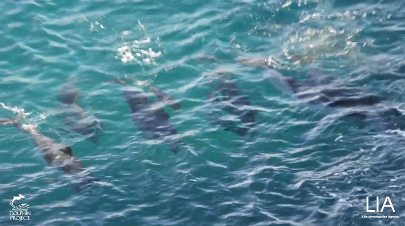 Bild: Zwei Streifen Delfin Mütter und ihre Familienmitglieder schwimmen in den letzten Minuten während des brutalen Terrors zusammen bevor sie unter den Planen nebeneinander niedergestochen werden