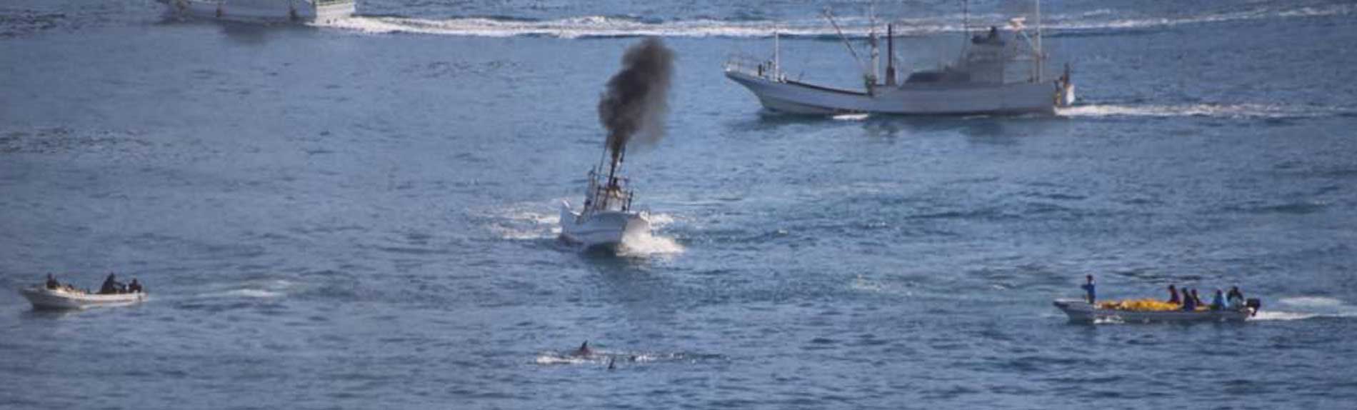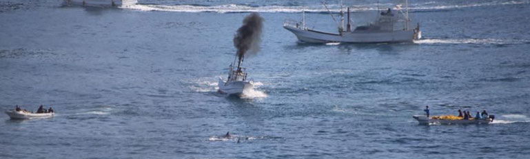 Bild: Das Jagdschiff links überfährt die Delfine mit Vollgas