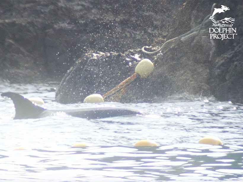 Als der einzelne Delfin hinter dem Netz in der Bucht gefangen war, reagierte er sichtlich aufgeregt, nahe am Netz schwamm er nervös hin und her, versuchte verzweifelt einen Ausgang zu finden um zu seiner Familie zurück zu schwimmen die in diesem Moment von 12 Jagschiffen und mehreren Booten terrorisiert wurde.