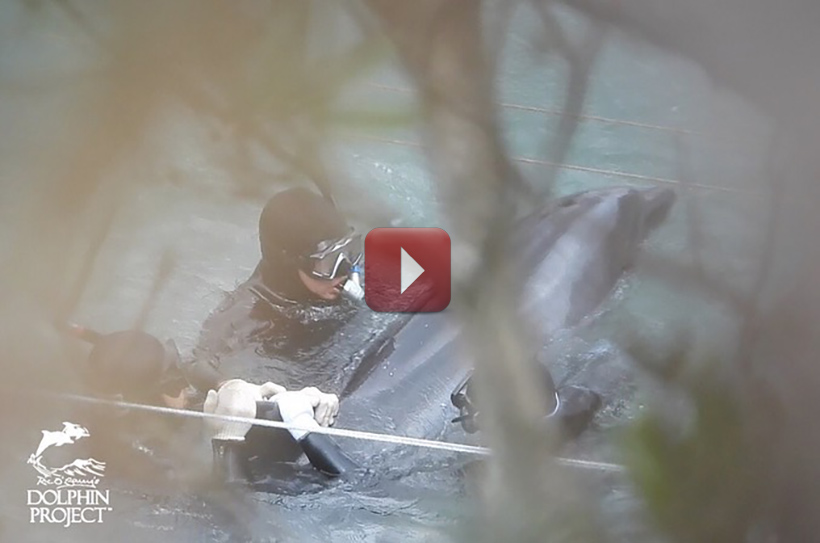 Nachdem die verängstigten Delfine unter den Planen an der Schwanzflosse gefesselt ans Ufer gezogen worden waren, fuhr ein Boot mit Trainern in die Bucht um in einem Auswahlverfahren die schönsten Kinder von ihren Mütter zu stehlen. Die brutale Selektion für Gefangenschaft Auswahl dauerte mehrere Stunden.