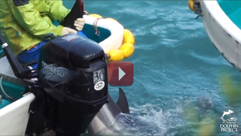 Inmitten des Chaos und Panik während des Terrors in der Bucht vor dem Tötungs-Strand, warf sich einige Delfine gegen die Felsen und mindestens zwei in Panik geratene Delfine verfingen sich schwer in den Netzen, bevor sie von Tauchern gewaltsam herausgerissen, unter die Plane gezogen und ihre Wirbelsäule von den Mördern mit einem Eisenstab zerstochen wurde.