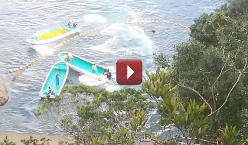 Bild: Unvorstellbar brutaler Terror mit Bootsmotoren und Schiffsschrauben gegen die wehrlosen, erschöpften mit grösster Angst und Panik überschütteten Delfinfamilie im Netz in der Bucht
