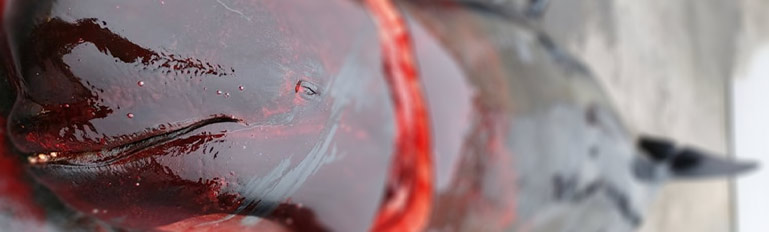 Bild: Wie muss dieser Delfine wohl unvorstellbar gelitten haben während ihm ein färöischer Psychopath den Nacken mehrmals durchtrennt hatte. Es wurde oftmals filmisch dokumentiert, dass die Delfine nicht gleich tot sind, wie die Färöer behaupten. In einem Video dauerte der Todeskapf eines aufgeschlitzten Delfins über 3 Minuten.
