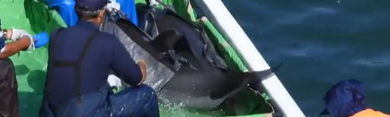 Ein entführtes Delfinkind hat die brutale Tortur nicht überlebt, es verstarb an den Folgen der Gewalt im Schwimmkäfig im Hafen von Taiji. Ein Killer/Entführer band dem kleinen Meeressäuger einen Strick um die Schwanzflosse. An einem Killer-Boot mit dem Seil an der Schwanzflosse gefesselt, schleppten die Monster von Taiji den kleinen Leichnam des zu Tode geprügelten Delfinkind ins Metzgerhaus.
