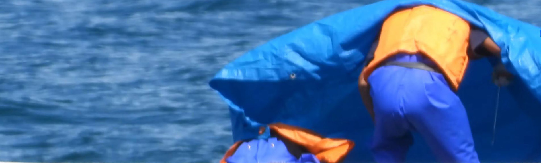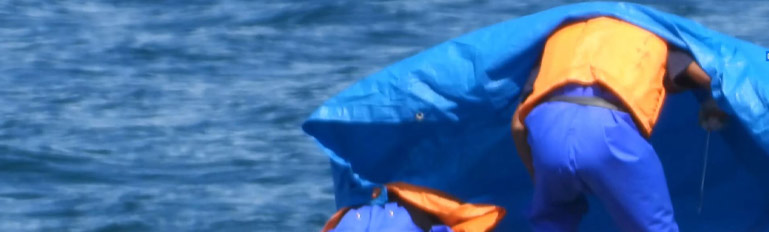 Bild: Killer auf der Linken Seite bringt dem anderen Killer rechts unter der blauen Plane einen Hammer, mit dem schlagen und hämmern die Mörder den Delfinen den Eisenstab in die Wirbelsäule