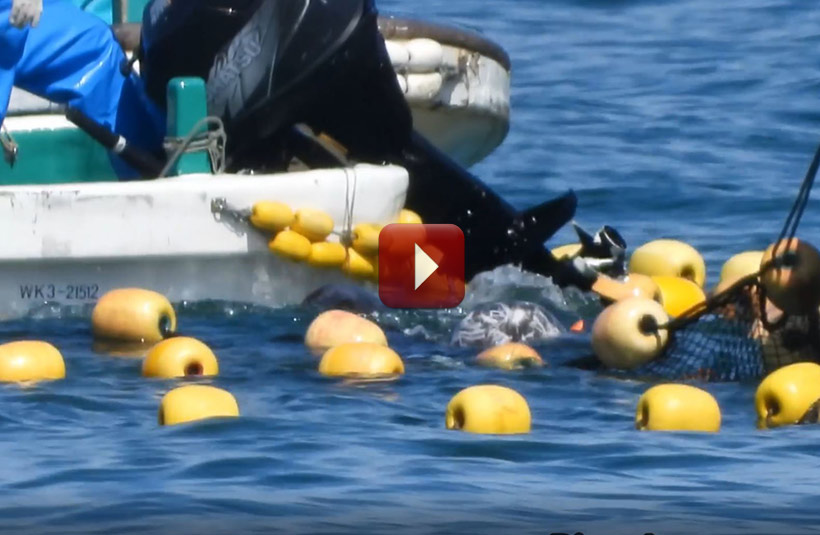 Zwanzig Minuten später, nachdem die Delfinfamilie mit einem Netz eingekesselt war, kam ein Boot mit Tauchern, Trainer und weitere Killer dazu, um die Wahre für China‘s Delfinarien-Wahnsinn auszusondern und zu entführen. Gemeint sind die hübschen Delfinkinder dieser Familie, die für die Sklaverei gegen ihren Willen in Taiji abgerichtet und für mehrere Hunderttausende USD nach China verkauft werden, wo sie mit billigen Tricks dumme Menschen unterhalten müssen, die mit ihren Tickets den Betreibern von Delfinarien ein vermögen zahlen.