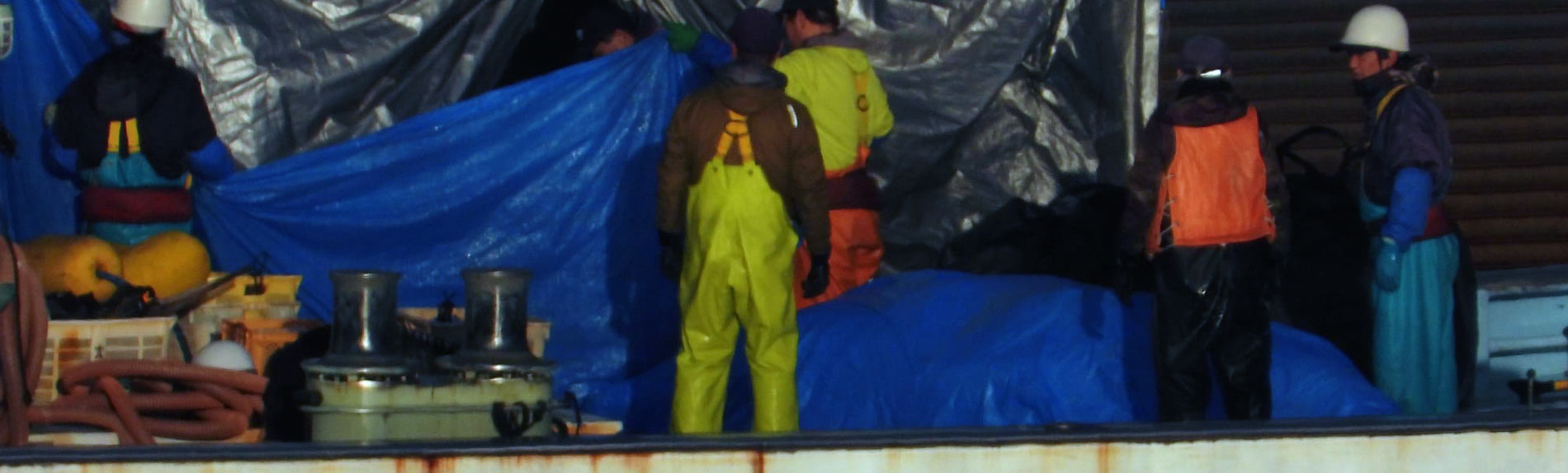 Bild: Ein weiterer ertränkter Wal wird ins Metzgerhaus in Taiji gezogen, mit blauen Planen versuchen die Killer dieses Verbrechen zu verdecken und vertuschen