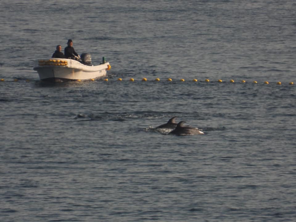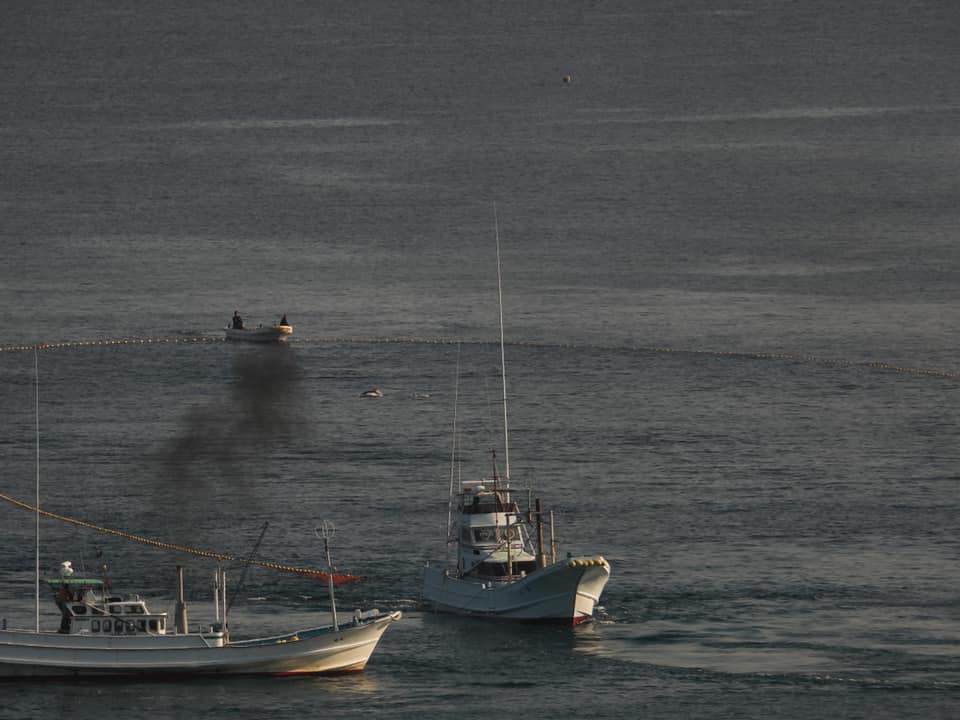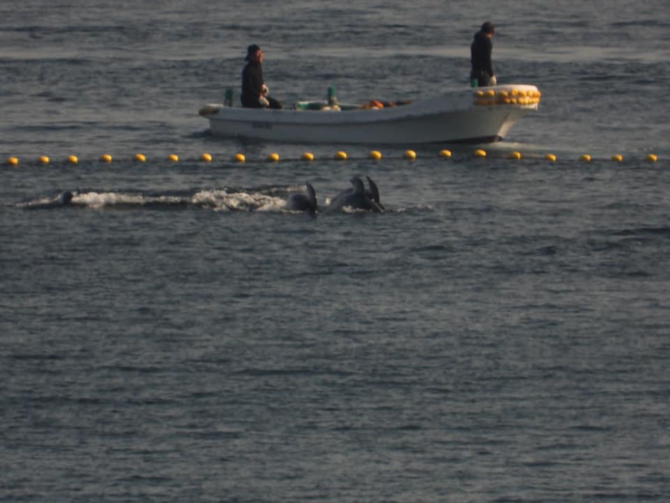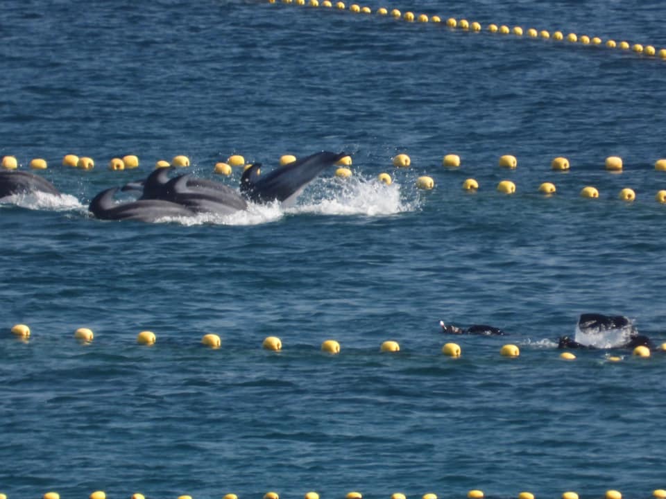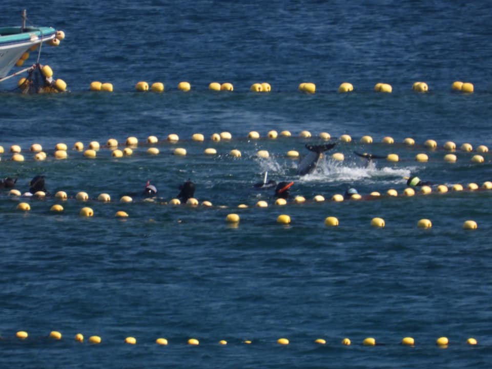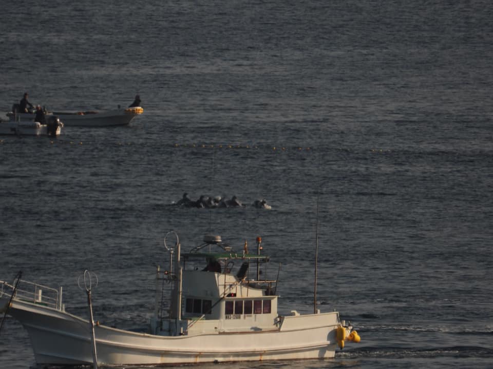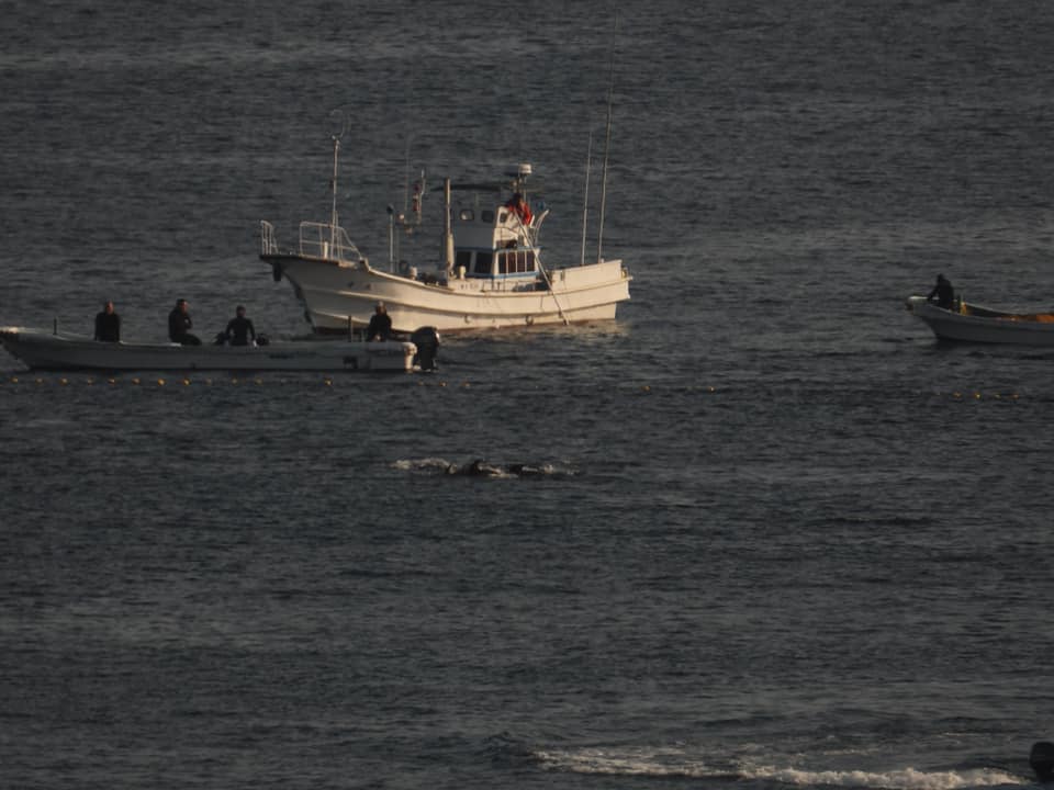 Ein paar wenige Delfine wurden offshore, etwa 600 Meter draussen vor der Bucht mit einem Netz eingekreist. Im Hintergrund sahen wir in Kunito’s Livestream die grosse Gruppe in Richtung Ozean flüchten. Nach erster Einschätzung könnten über 50 Weissseiten Delfine im Netz eingesperrt sein. Wie viele es aber wirklich sind und wie viele von ihnen für die Delfinindustrie entführt werden, erfahren wir erst später.