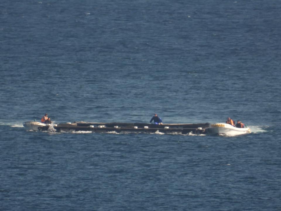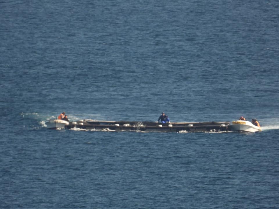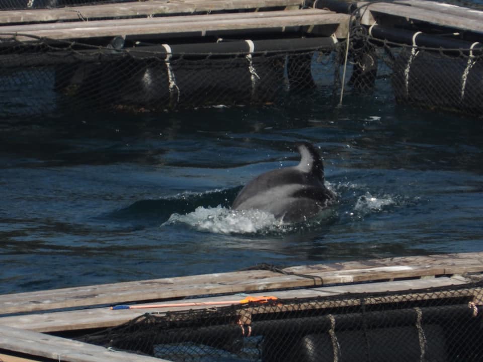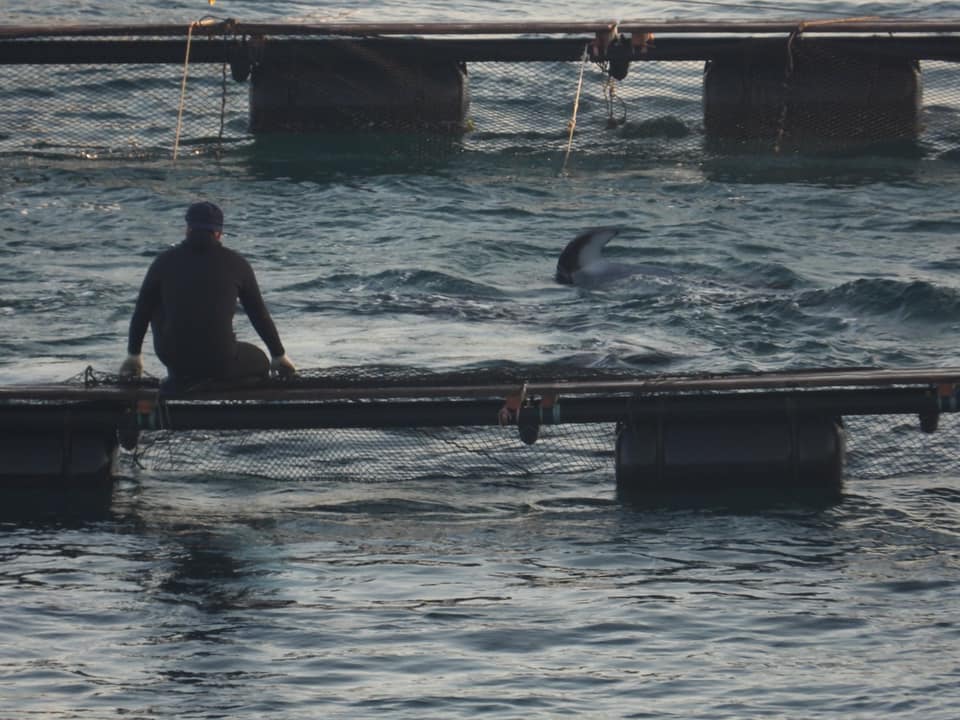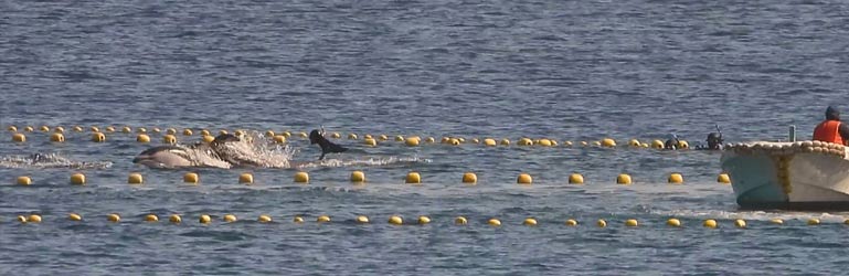 Bild: Killer ziehen ein Schwimmkäfig mit gestern entführten verletzten Weisseiten Delfine auf See hinaus um sie zu entsorgen