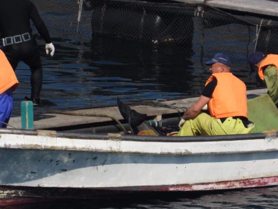 Bild: Ein gerade eben gewrestleter entführter Delfin wird zu den Schwimmkäfigen im Hafen transportiert